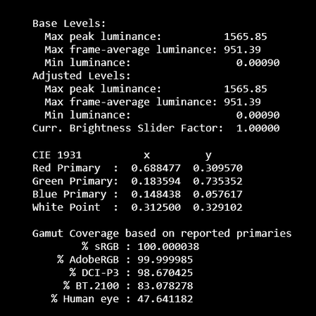 Что касается максимальных возможностей дисплея, то все они достаточно точно описаны в его характеристиках Display IDs, которые с легкостью читаемы специальным приложением для проверки функции HDR. В пике PG32UQX показывает 1650 нит при заполнении 2-3 %, 1560 нит при 10 % и 968 нит при 100 %.