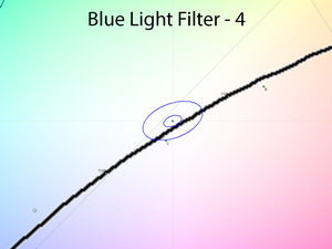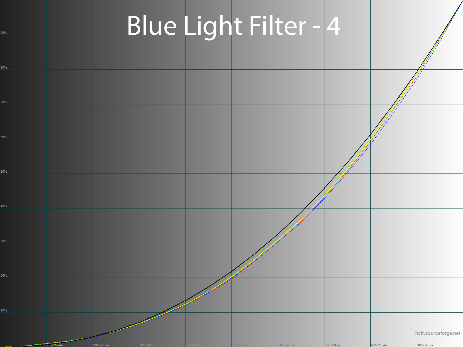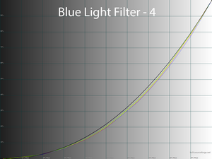 В Blue Light Filter – 4 производитель не стал снижать контрастность и оставил её на заводском уровне. Разница лишь в резко сниженной яркости, суженом цветовом охвате и точками чёрно-белого градиента, улетевшими за пределы изучаемой области, что, в целом, является вполне объяснимым действием.