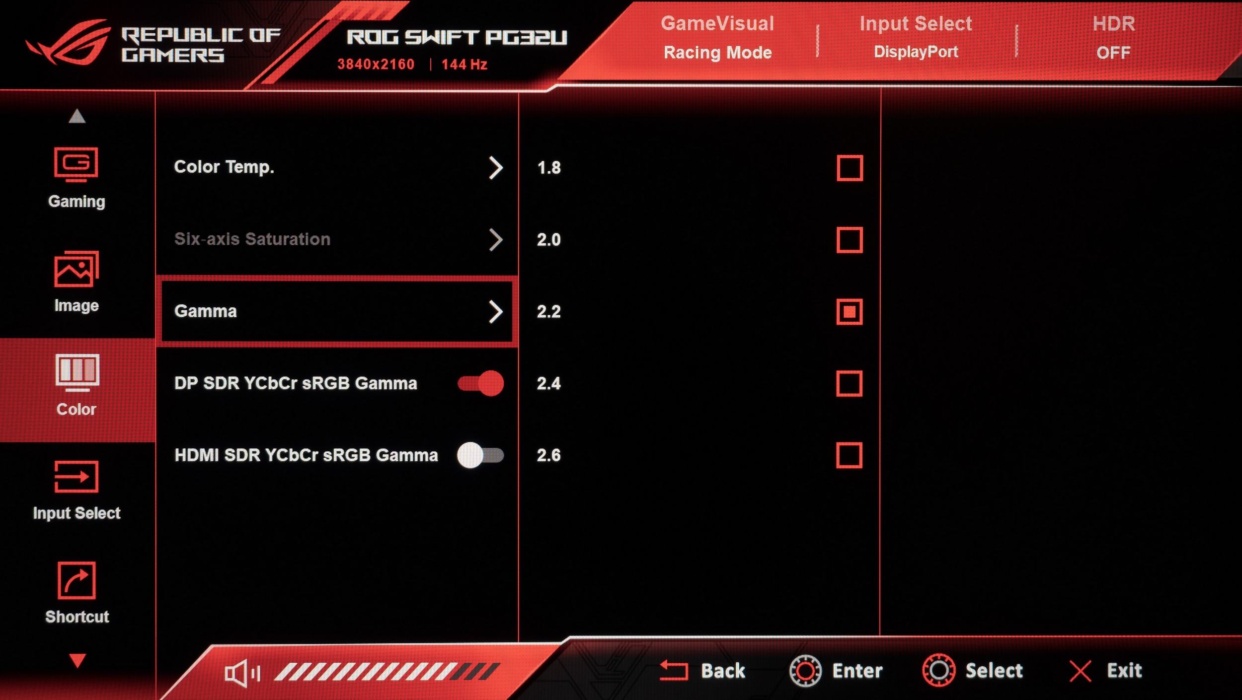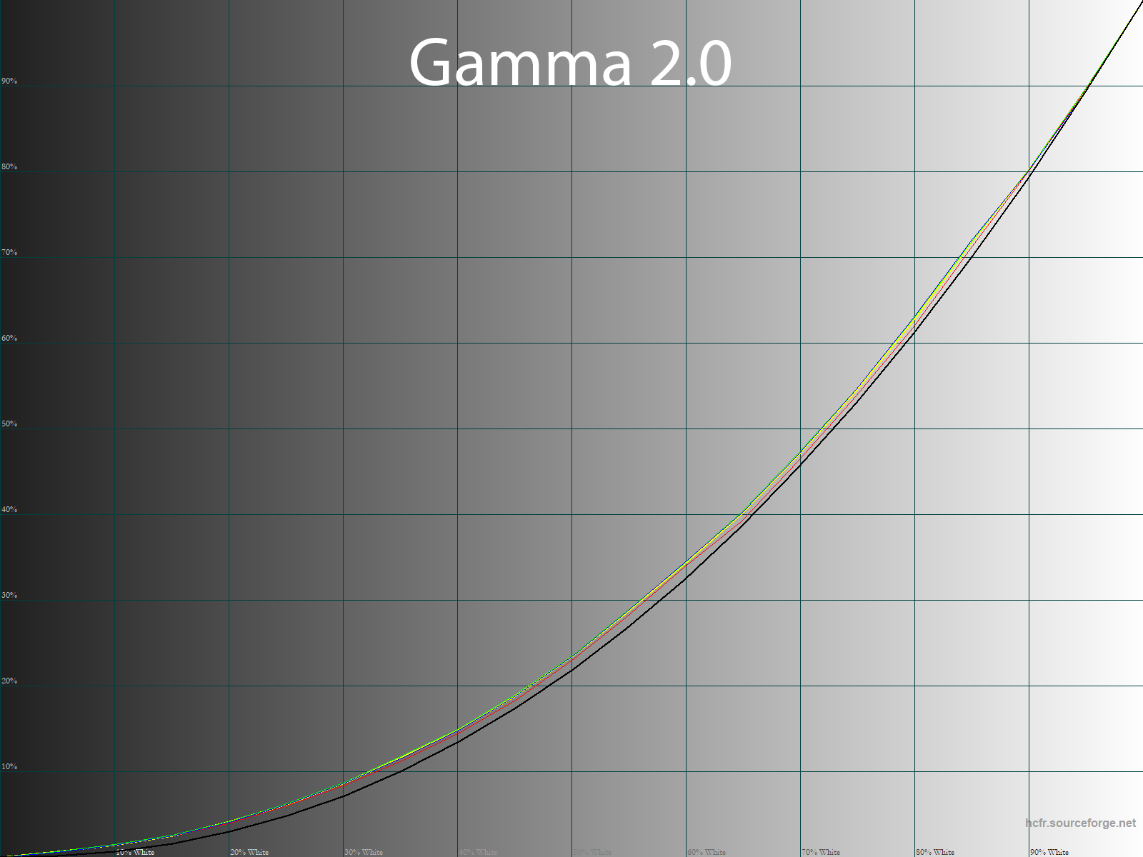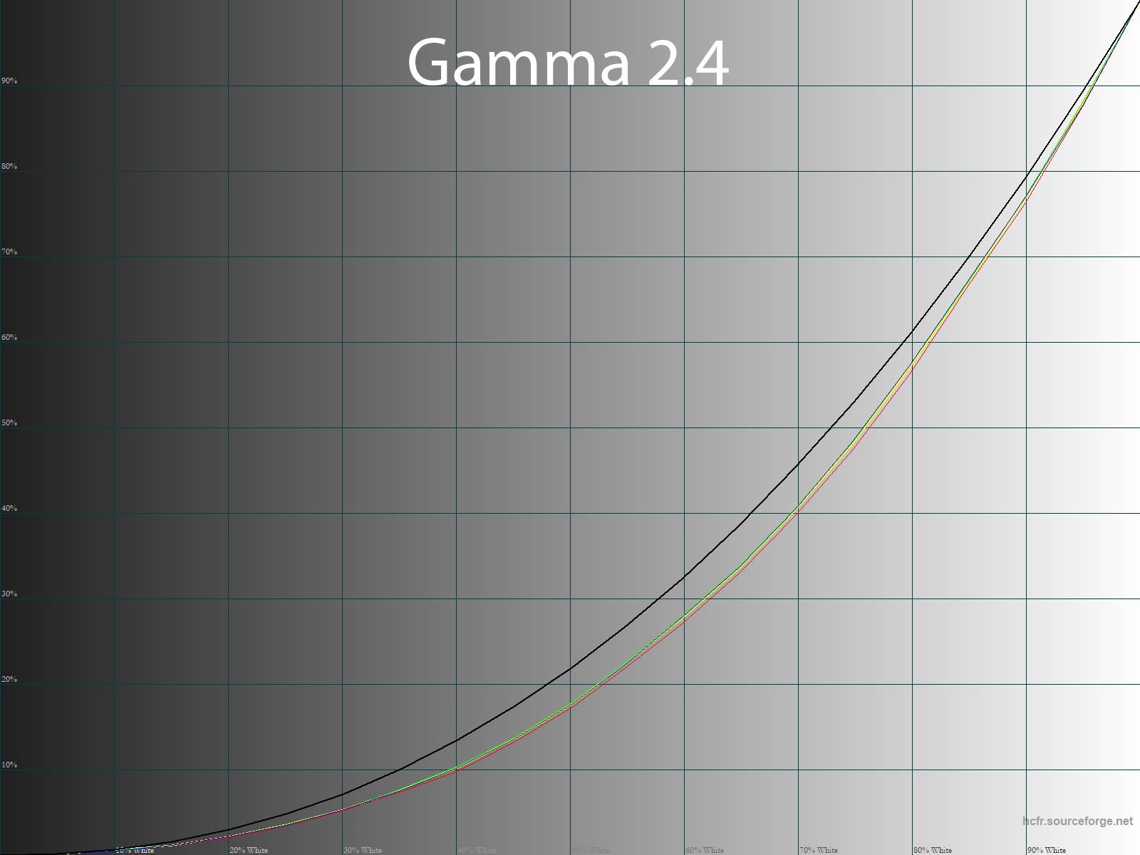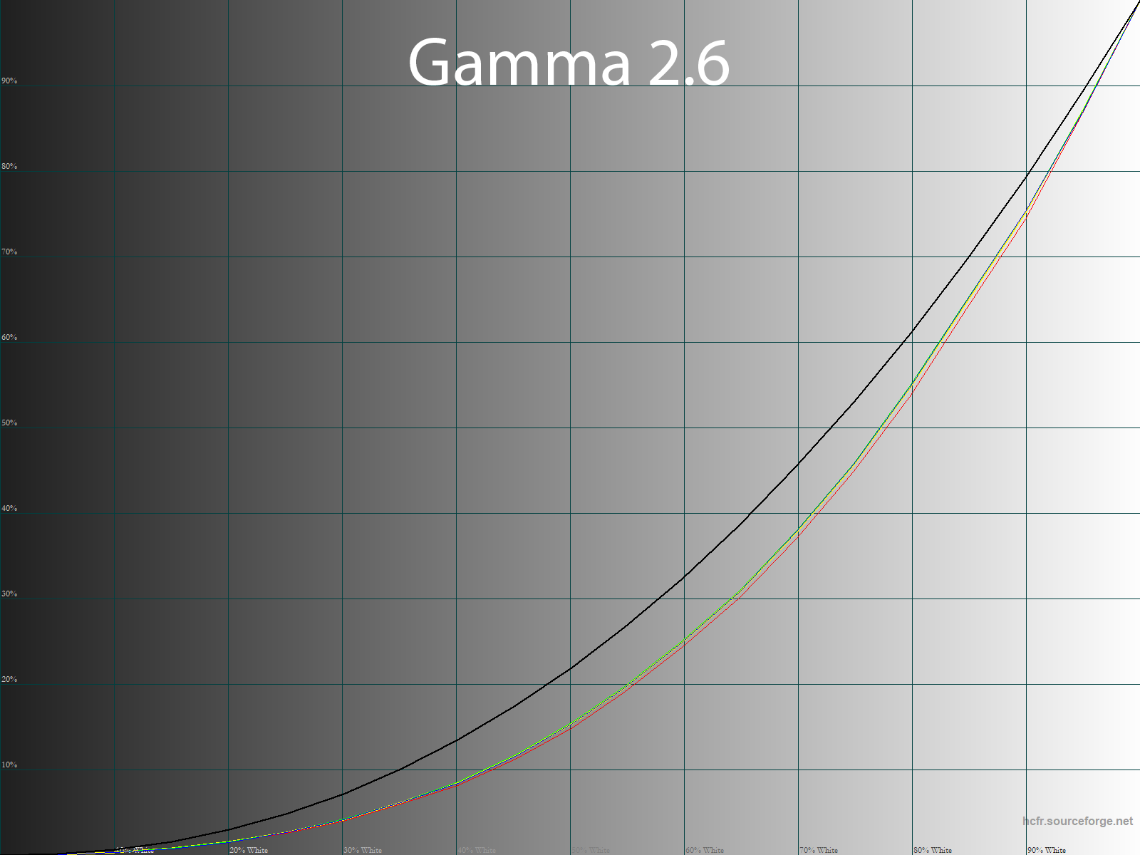 Из дополнительных режимов гаммы в PG32UQX есть варианты от низкоконтрастного 1.8 до 2.6. Все режимы настроены достаточно точно к указанным значениям, без видимых расхождений RGB-каналов, а поэтому смело можете пользоваться любым из них при желании сделать картинку на свой вкус (особенно актуально для игроков). Главное помните, что основным стандартом является 2.2 и именно в нём вы получите точную цветопередачу, без вкусовщины.