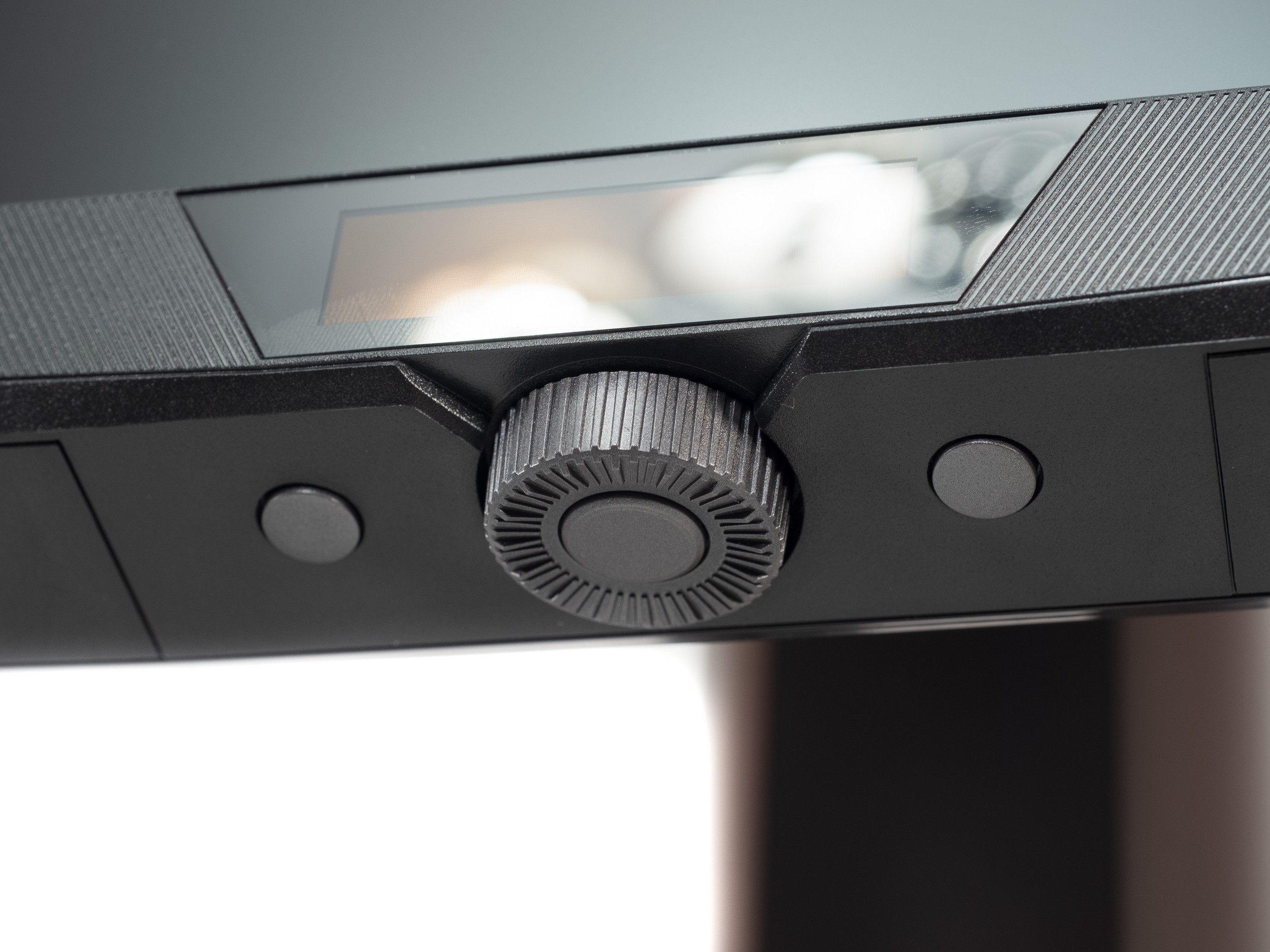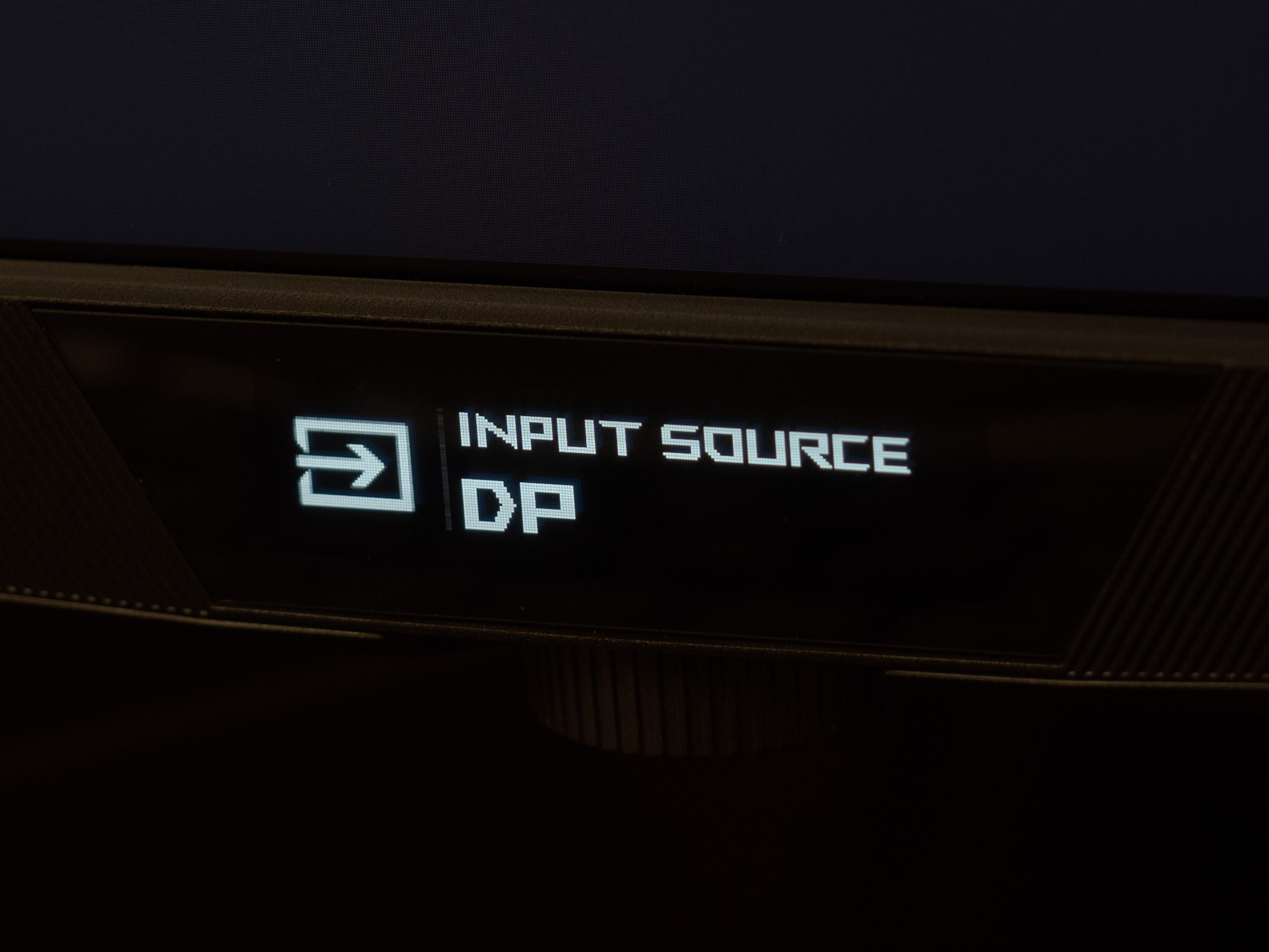 В новом PG32UQX используется заново разработанная система управления, в основу которой положена механическая шайба с интегрированной кнопкой и двумя дополнительными клавишами рядом, а по правую сторону расположился индикатор питания.