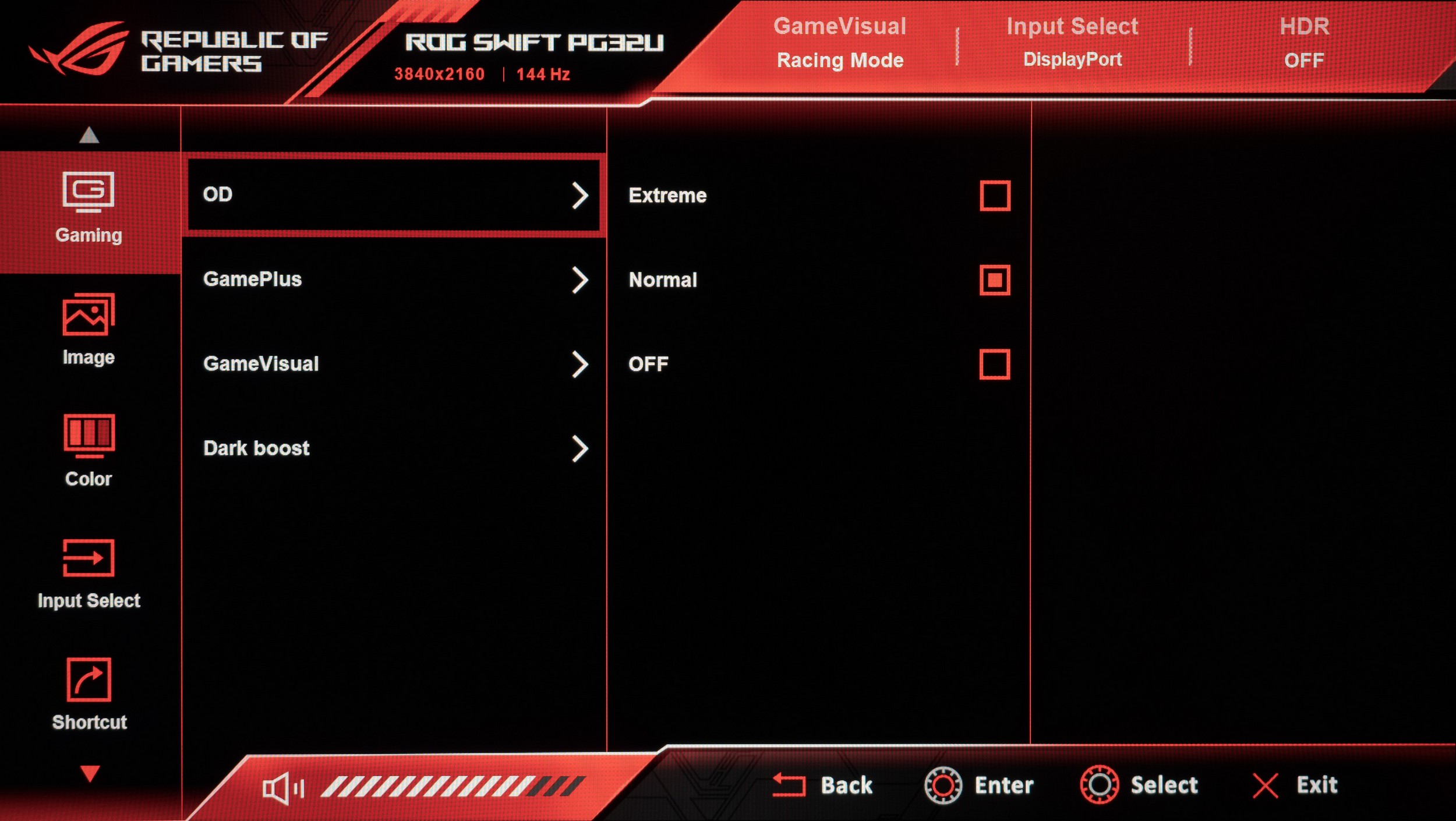 Несмотря на класс монитора и его крайне высокую стоимость, порадовать высокой скоростью отклика PG32UQX вас не сможет. При заводских установках OD (режим Normal) модель демонстрирует хорошо заметные артефакты и скорость на уровне куда более доступных IPS моделей из предыдущего поколения (не Fast-IPS). При выключении OD шлейфы увеличиваются, смазанность движущихся объектов растёт, но артефакты полностью исчезают. Последний режим Extreme мы же просто не советуем использовать – ничего кроме сильнейших артефактов в нём вы не найдёте.