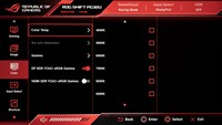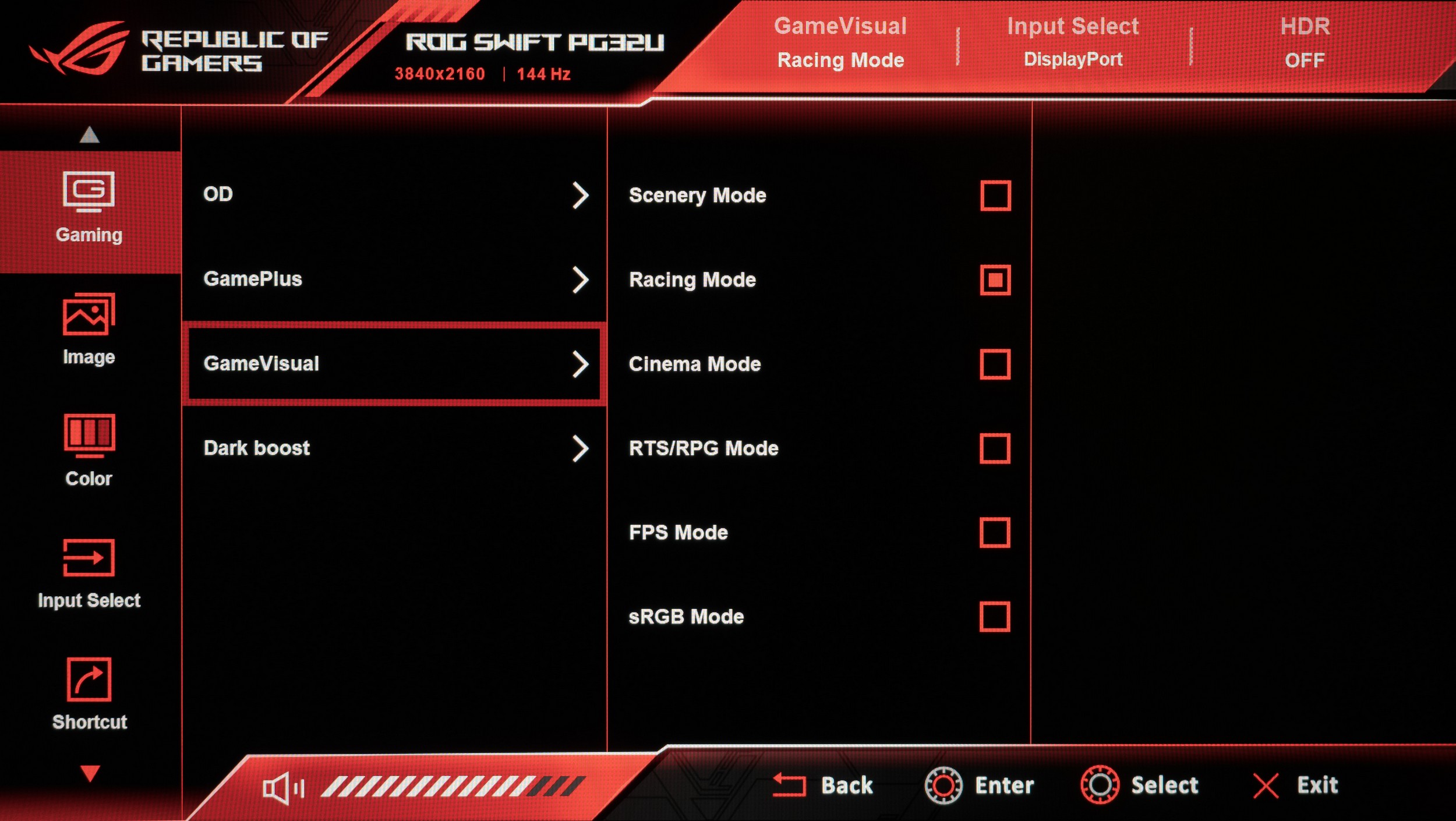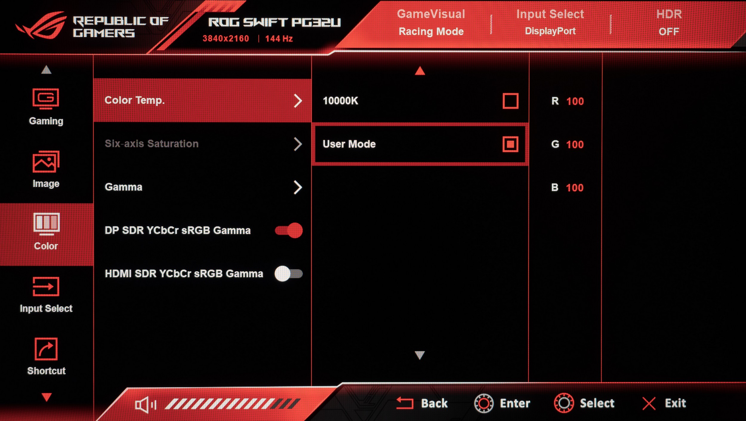 В ASUS PG32UQX предустановлено шесть основных режимов GameVisual для каждого из которых доступно изменение рабочего цветового пространства. Для тестирования мы выбрали только несколько сочетаний среди наиболее корректно настроенных и интересных для использования.