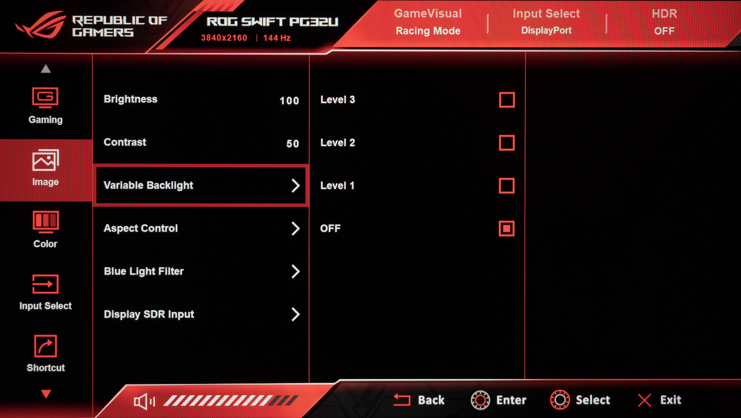 Увеличение количества отдельно управляемых зон положительно сказалось на возможностях для воспроизведения HDR. Производитель добился снижения гало-эффекта, однако, заметить его всё равно достаточно просто, особенно в сценариях, где HDR-контент не используется, а происходит обыкновенная проверка технических возможностей устройства. Кроме того, не стоит забывать, что подсветка не может гаснут и загораться незаметно (особенно когда монитор оперирует крайне широким диапазоном регулировки) и не спасает PG32UQX даже третий (и самый быстрый по скорости) режим работы Variable Backlight. Другими словами – стало, безусловно, лучше, чем у предыдущих решений с 384-512 зонами, но назвать используемую Mini-LED подсветку идеальной мы не можем.