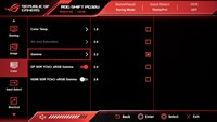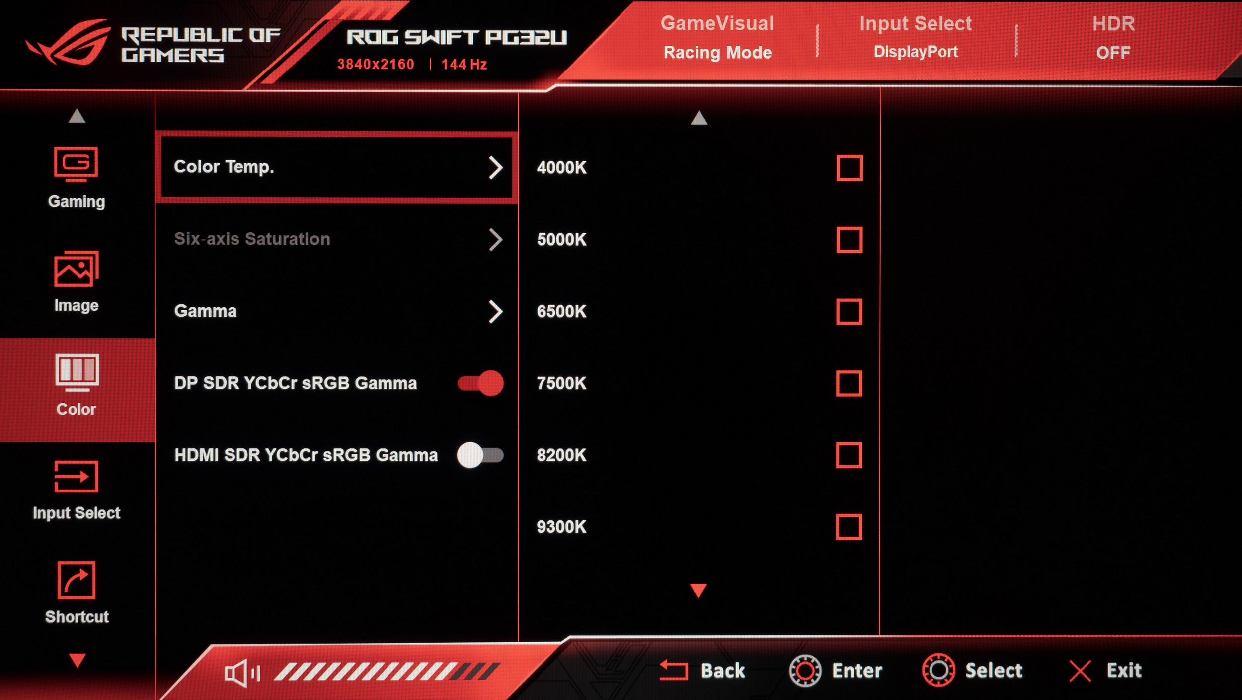 Важные параметры картинки на экране есть и в третьем разделе Color. В нём вы можете встретить режимы цветовой температуры и возможность вручную определить степень усиления RGB, также тут доступны пять режимов гаммы и активация поправок в сигнал при использовании с системами без поддержки технологии DSC.