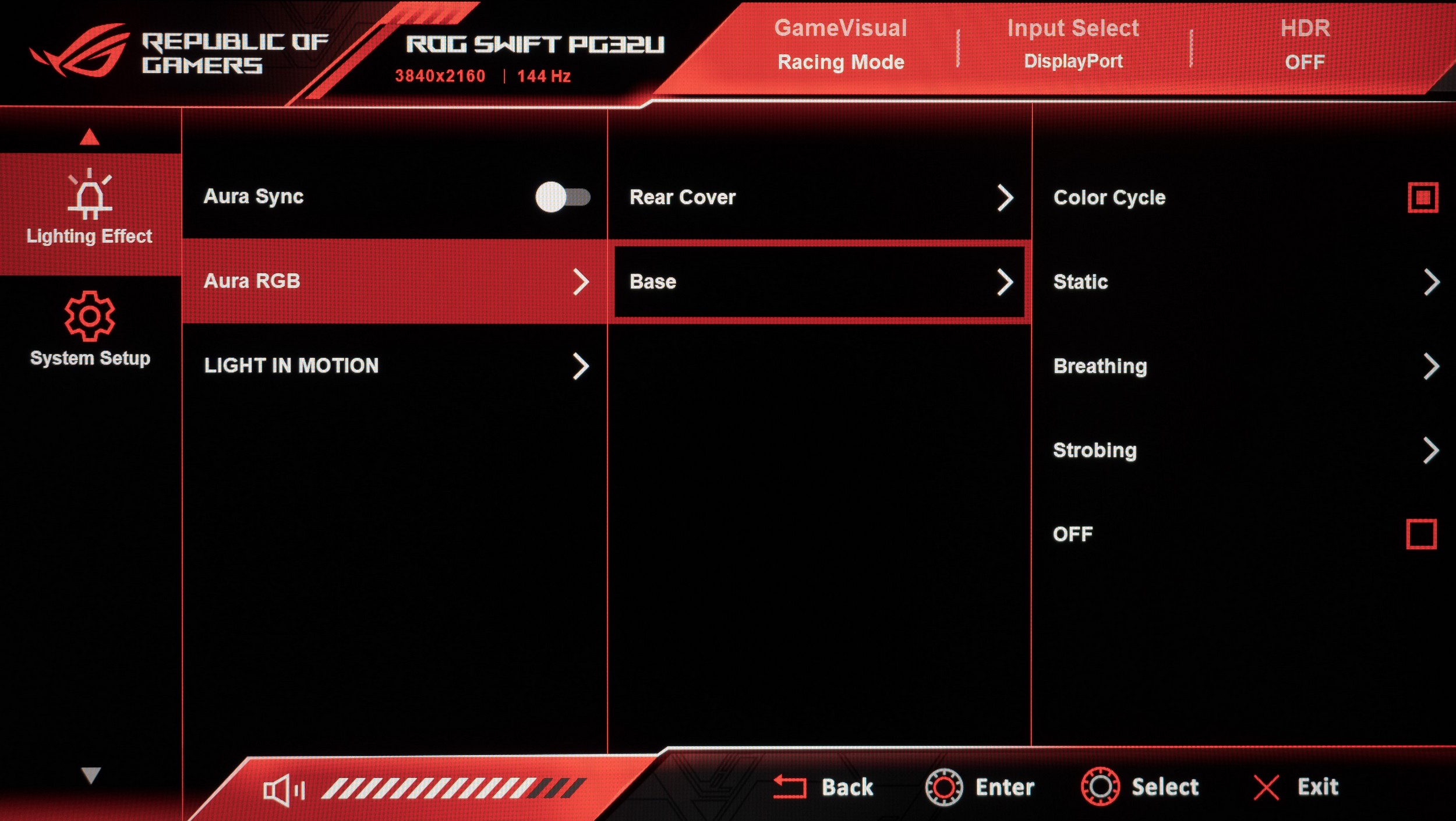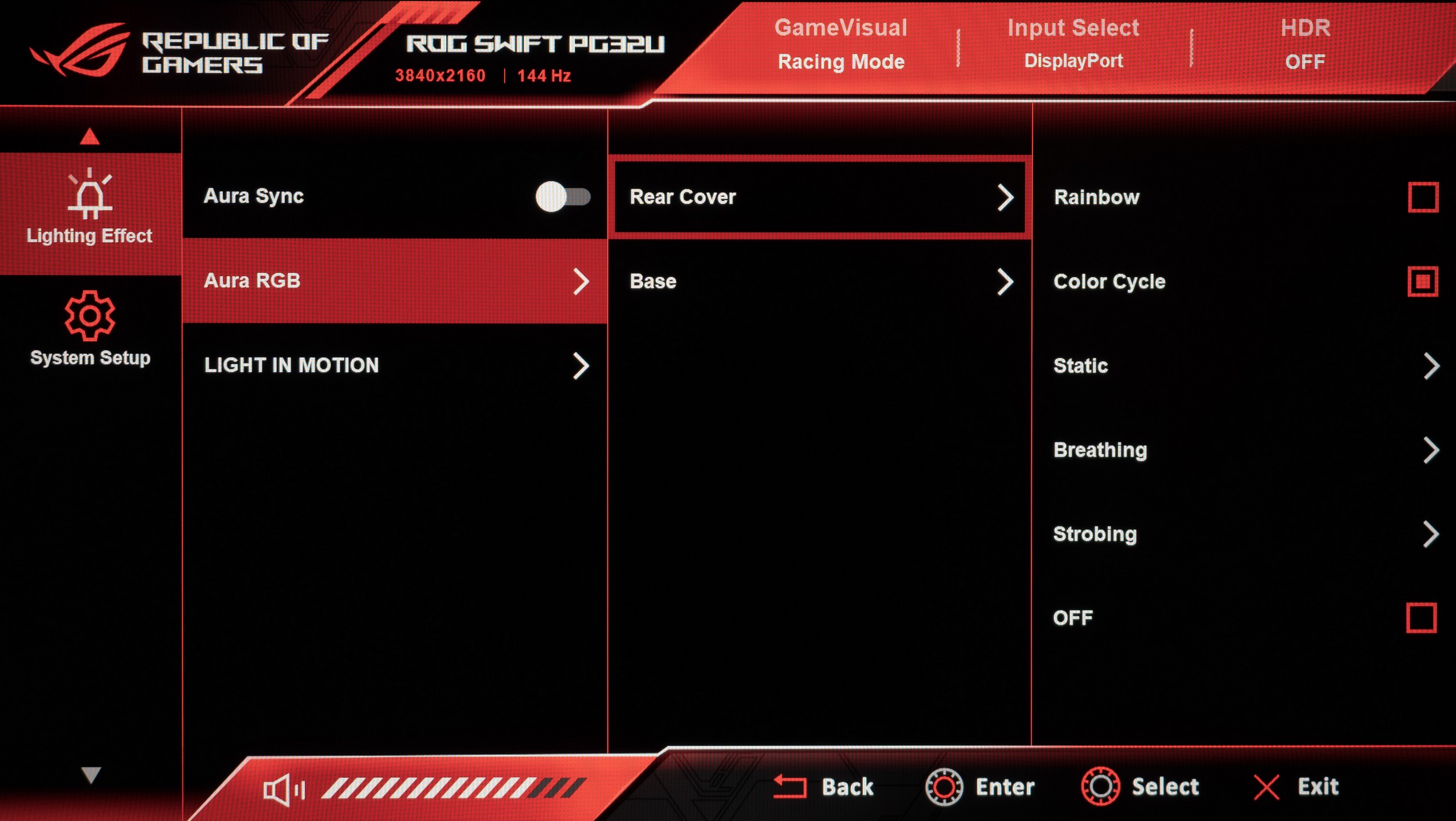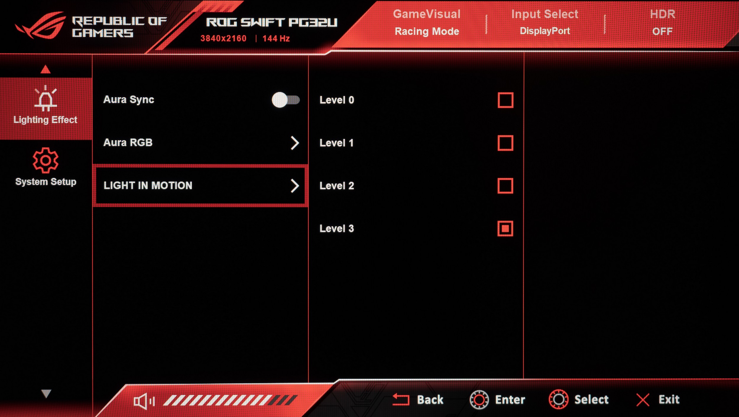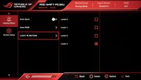 В пятом разделе, Lighting Effect, предлагается включить красную подсветку LIGHT IN MOTION (она же Light Signature), настроить разноцветную Aura RGB и активировать синхронизацию Aura Sync.