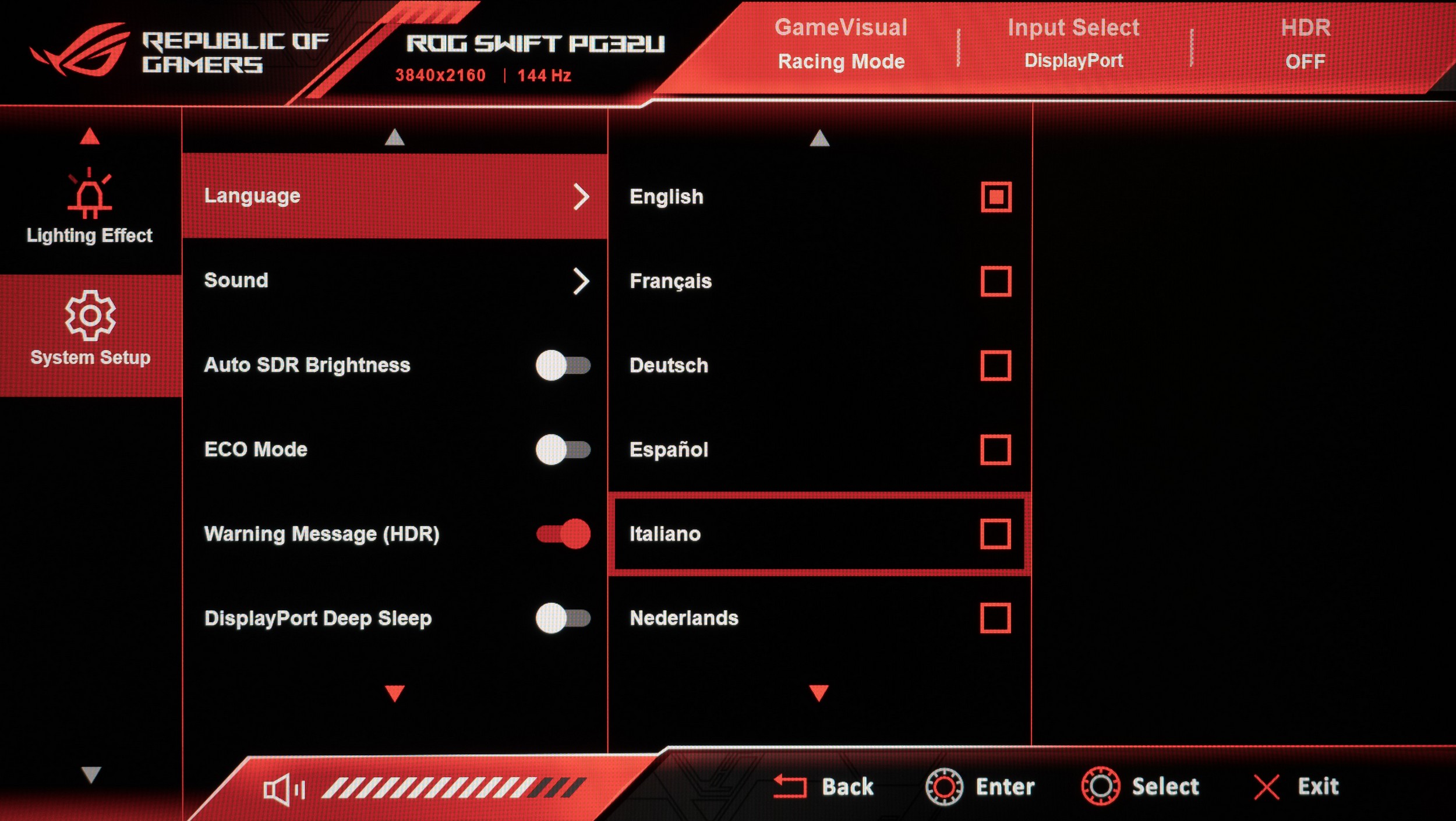 Выбрать язык локализации меню (присутствует русский, с хорошим переводом), изменить положение и прозрачность меню, определить время до его исчезновения, заблокировать кнопки, изменить уровень громкости подключённых наушников или колонок, выбрать версию DP – всё это можно сделать в последнем разделе System Setup.