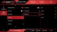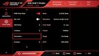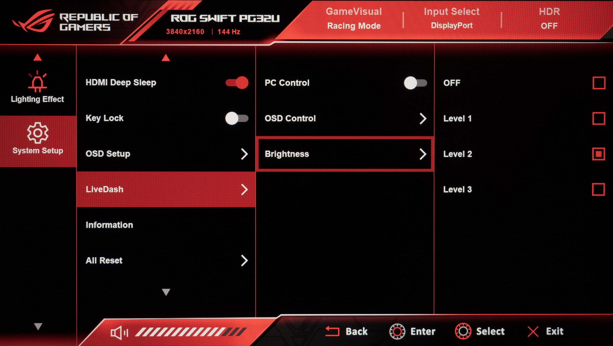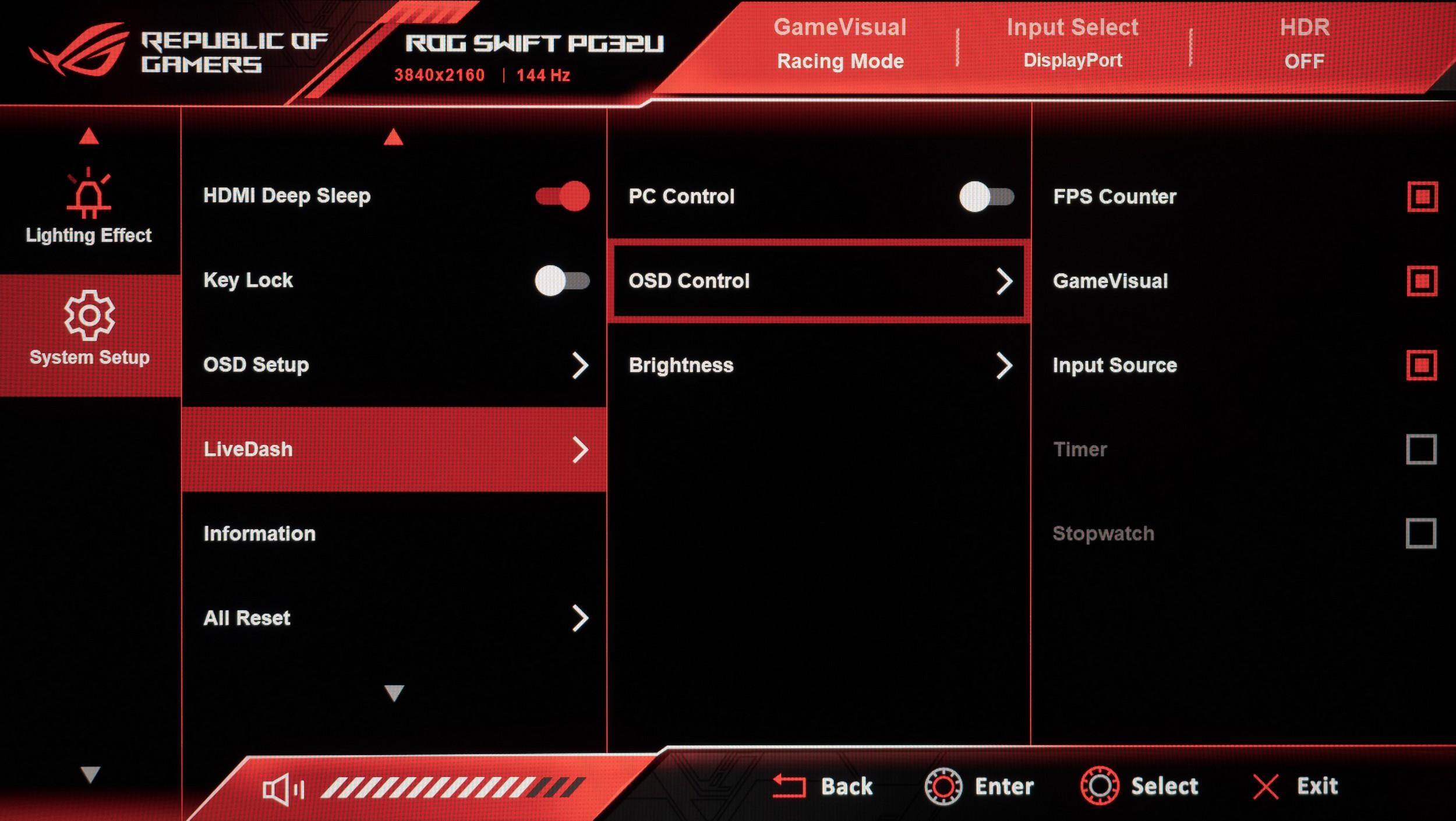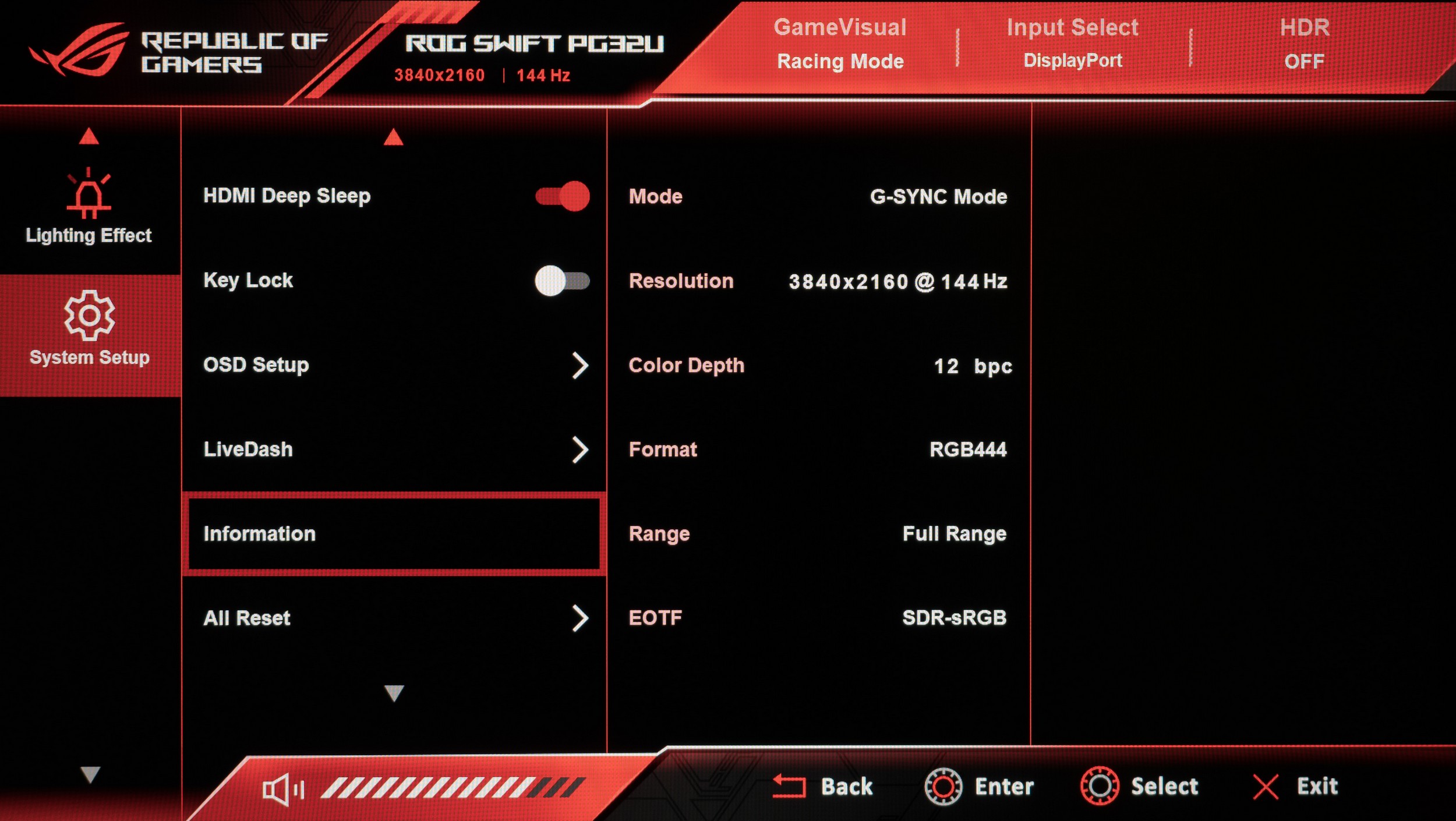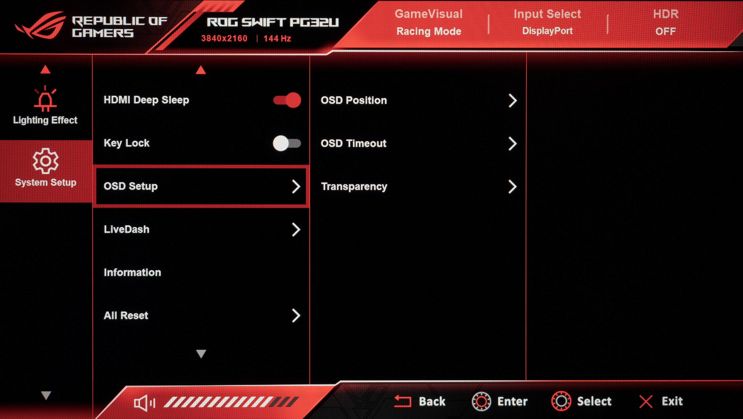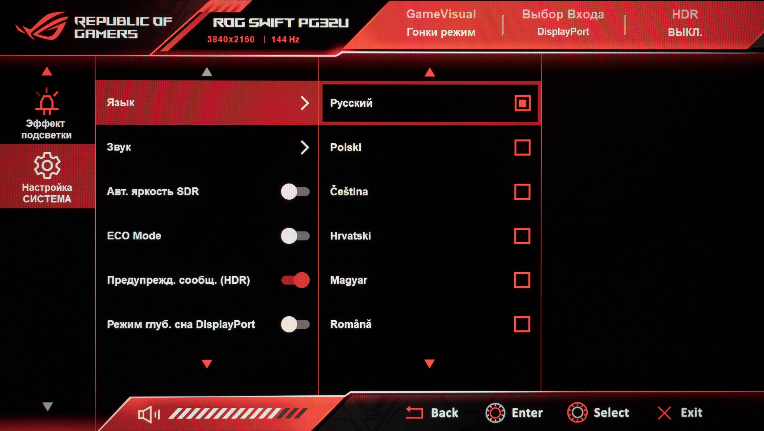 Присутствует подраздел с основной рабочей информацией по монитору, возможность включить предупреждение о переходе в режим HDR, активировать глубокий сон при DP и HDMI-подключениях и датчик внешней освещённости. Доступна настройка вывода информации на OLED (Live Dash) и, конечно же, функция сброса всех настроек меню к значениям по умолчанию.