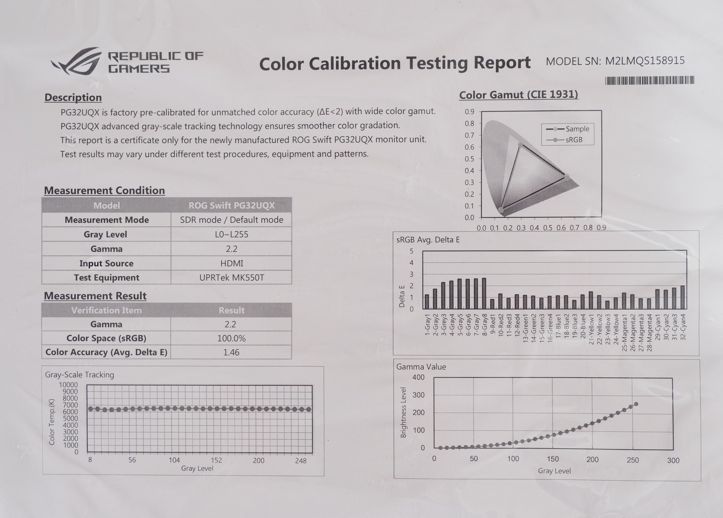 В ходе ручной настройки и полноценной калибровки с правками в LUT видеокарты все пробелы в заводской настройке ASUS ROG Swift PG32UQX были исправлены. Мы получили идеальные гамма-кривые, правильный баланс серого, высокий уровень установки точки белого и широкий цветовой охват на уровне профессиональных моделей для работы с цветом.