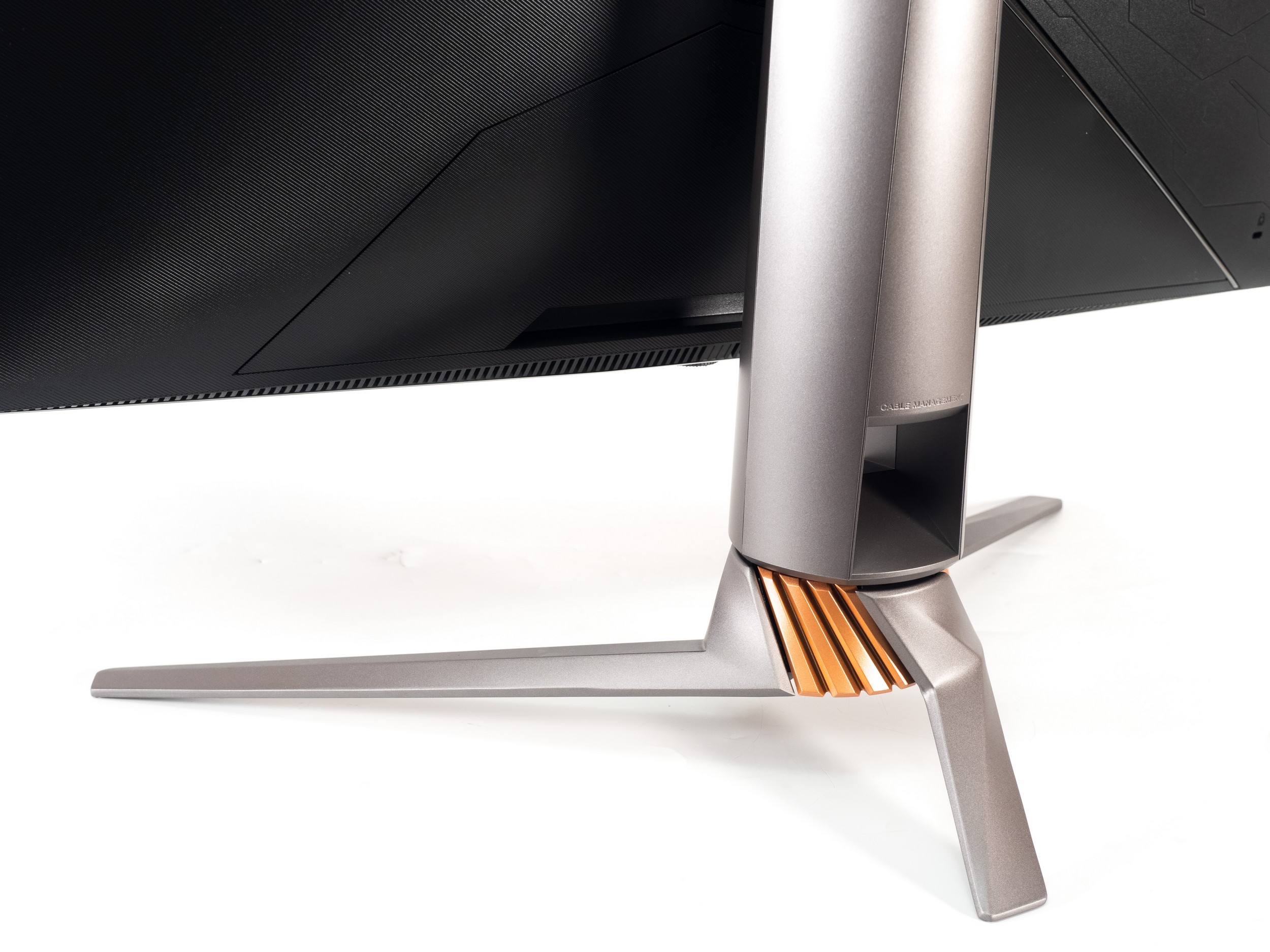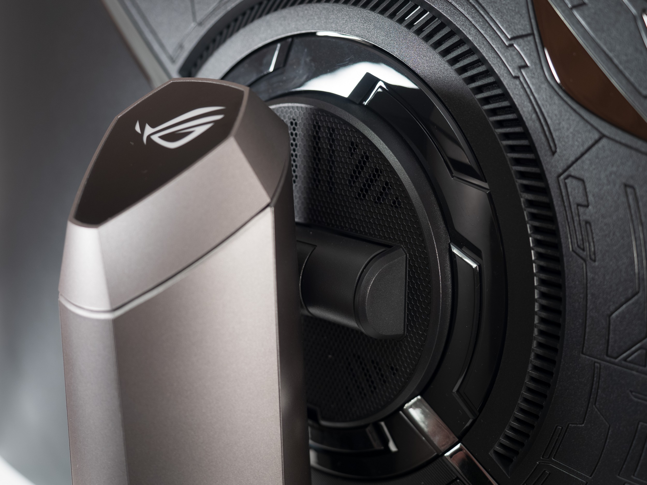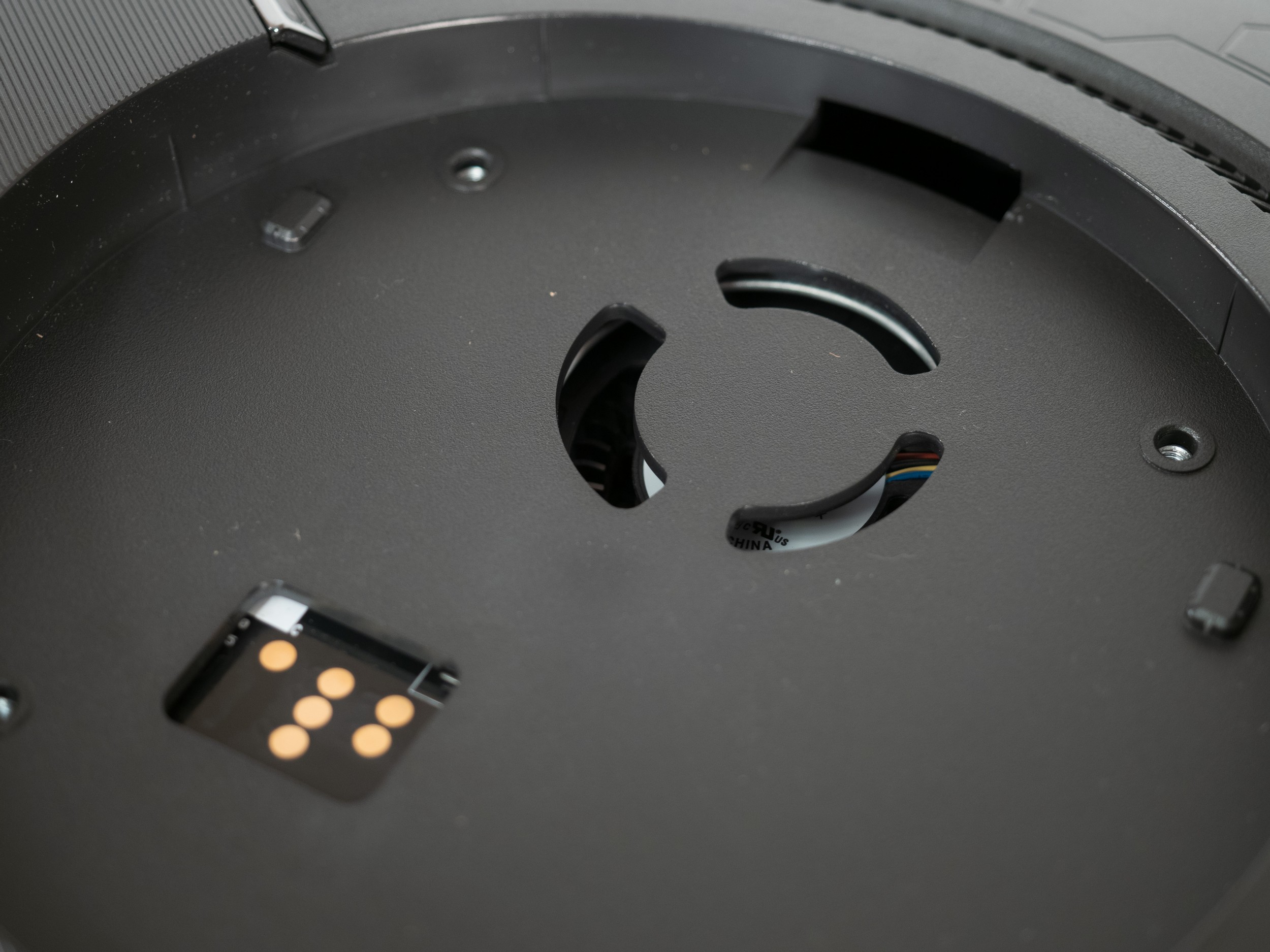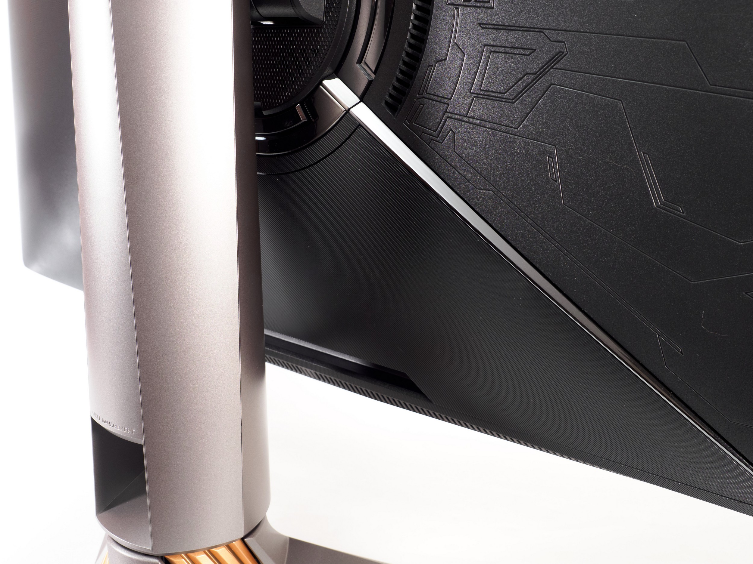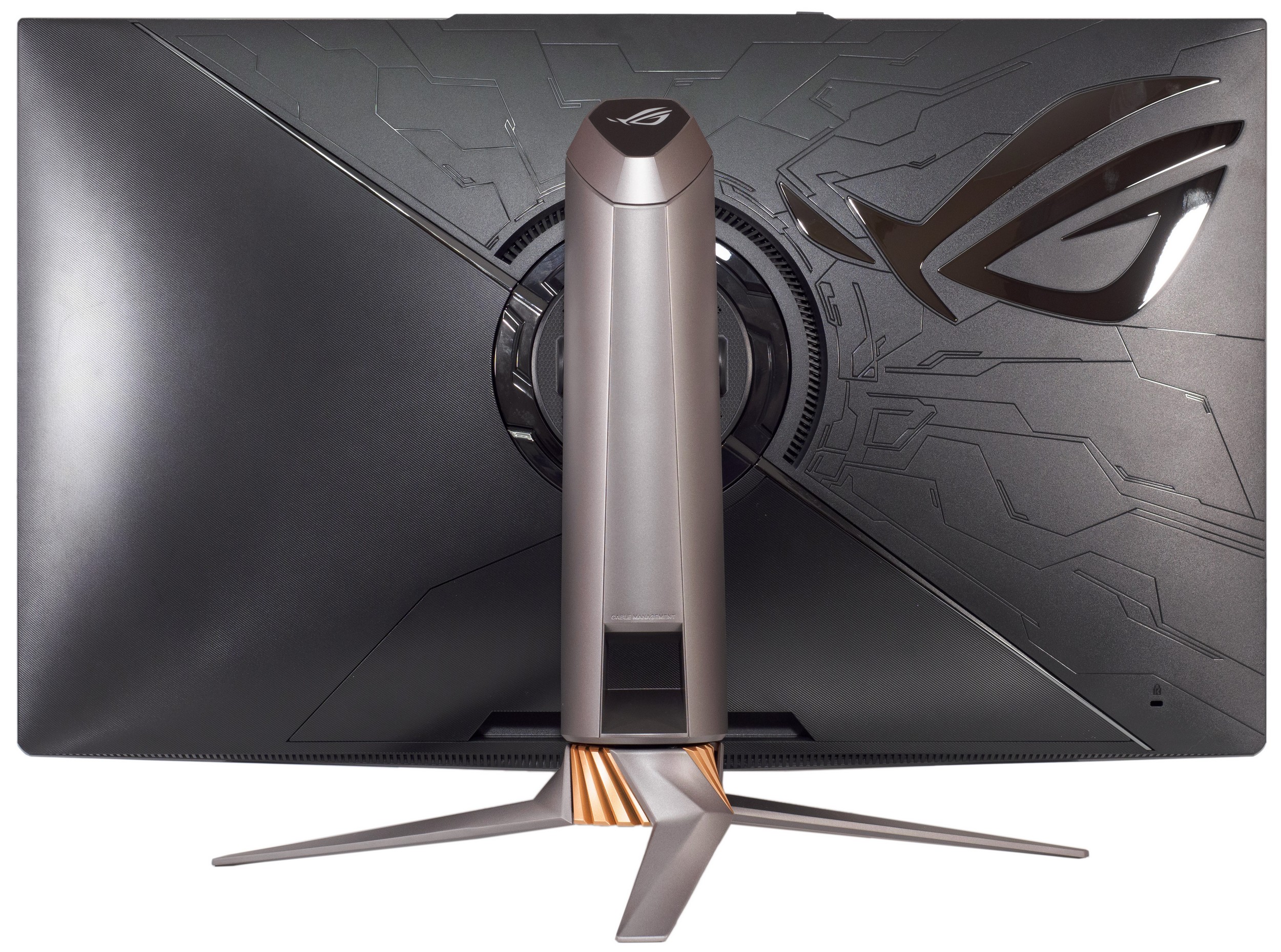 Быстросъёмное соединение у монитора отсутствует. Центральная стойка с завода прикреплена к подставке, а места крепления закрыты декоративными вставками. Добраться до них и воспользоваться совместимым VESA-кронштейном (если такой у вас, конечно, имеется) можно с помощью плоской отвёртки. Достаточно поддеть ею нижнюю часть пластикового обрамления, после чего удалить всю остальную «мишуру» вокруг и открутить четыре винта. Кроме желаемой находки там вы обнаружите контактную площадку для работы систем подсветки, размещённых на центральной стойке, а также небольшой вентилятор, тихо занимающийся охлаждением модуля G-Sync – его совсем не слышно.