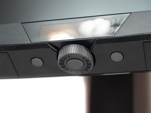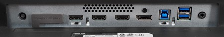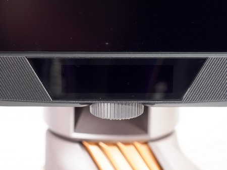 Вместо встроенной акустической системы для своей новинки компания ASUS порадовала нас установленным OLED-дисплеем для вывода различной информации (как через меню самого монитора, так и отдельное ПО), встроенным датчиком внешней освещённости для автоматической регулировки яркости подсветки и креплением для веб-камеры с USB 2.0 рядом (закрыт заглушкой).