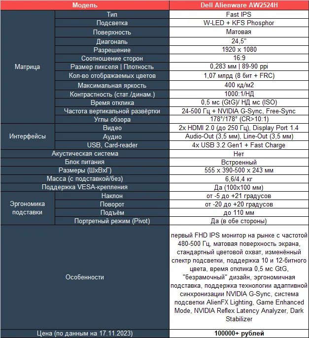 На конец ноября 2023 года Dell Alienware AW2524H – не один такой на рынке. В ассортименте компании есть и его упрощённая модификация, без уникальных функций, свойственных рассмотренной версии «для поклонников графики NVIDIA», но в остальном же смысл остаётся всё тот же, ведь матрица в моделях – идентичная. Выходит, что выбор есть, пускай пока и крайне ограниченный. В остальном же сейчас пугают только цены и актуальность подобного сочетания характеристик конкретно под ваши задачи и используемое «железо». Выбирайте, решайте. Удачи в правильном выборе!