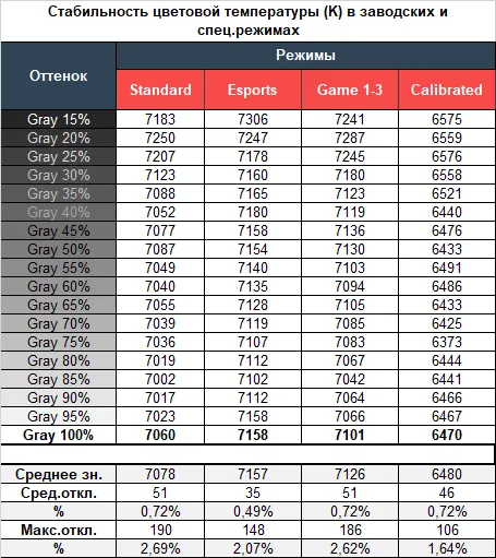 Продолжим изучение монитора Alienware AW2524H, более подробно оценив стабильность цветовой температуры в стандартных и специальных режимах изображения.