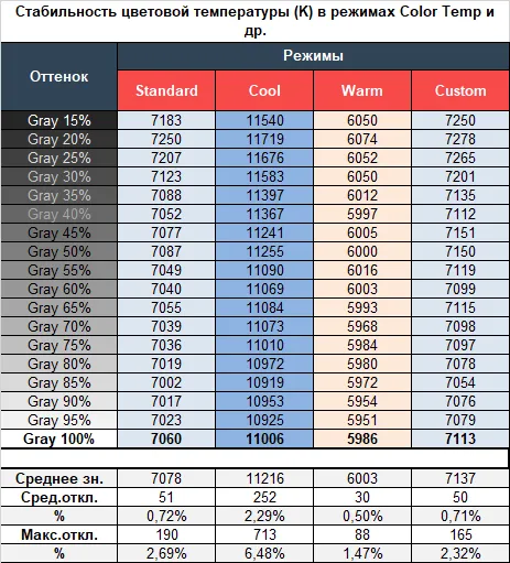 Результаты данной таблицы представляют из себя отклонения точек серого клина по оси X. Вертикальную ось они не затрагивают, а поэтому оценить наличие паразитных оттенков возможно лишь по CIE диаграмме из подраздела “Гамма-кривые и баланс серого”.
