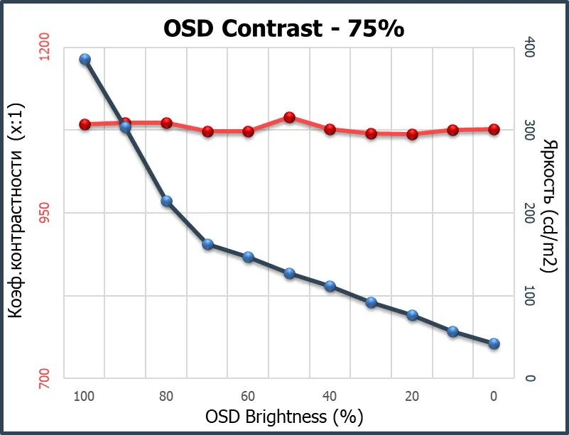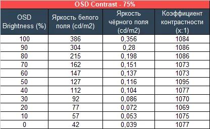 Для изучения стабильности контрастности и диапазона изменения яркости был выставлен режим Standard. Значение Brightness менялось с 100 до 0% с шагом в 10 единиц. Для представленной ниже таблицы измеренные значения были получены через программу HCFR, которая даёт возможность более точно оценить уровень чёрного (три знака после запятой) и соответственно определить достоверный коэффициент контрастности.