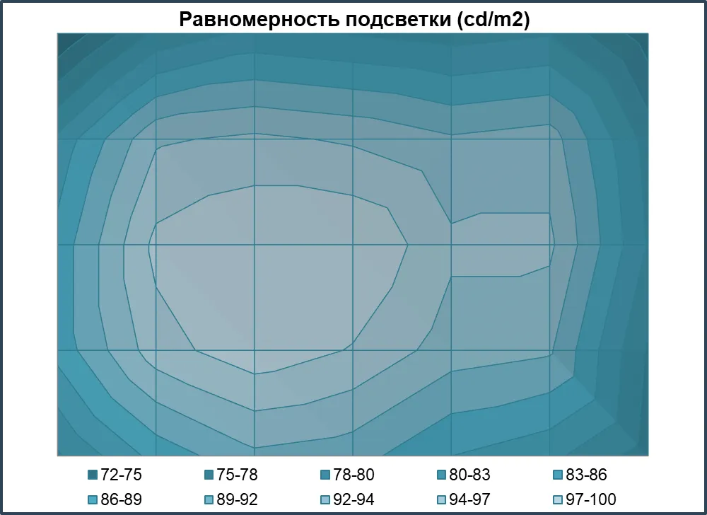 Равномерность подсветки монитора и цветовой температуры по полю экрана проверялась в 35 точках при установленной яркости монитора в 100 нит. За основу всех подсчётов (отклонений) брались данные из центральной точки.