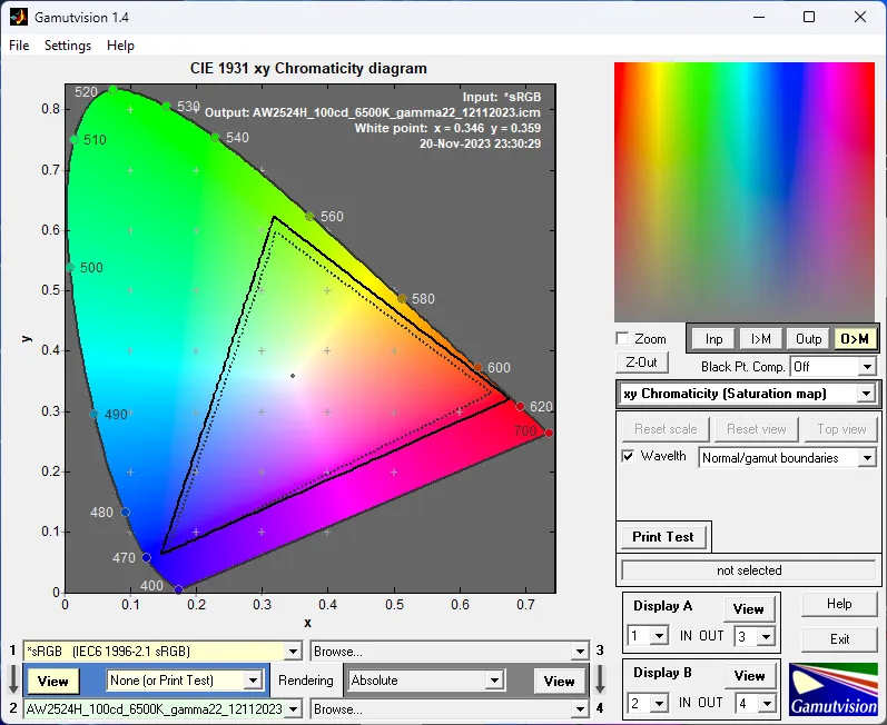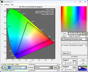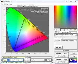 Первоначальная проверка осуществлялась при заводских настройках дисплея в режиме Standard. По представленным скриншотам видно, что две опорные точки из трёх заметно сдвинуты в пространстве относительно стандартного цветового стандарта sRGB, но назвать эту разницу важной для точной цветопередачи мы не можем. В таких условиях потребители, которым не принципиальна точная цветопередача, могут обойтись без профилирования (создания ICM|ICC профиля) и использовать стандартный системный профиль sRGB.