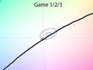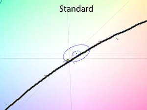 С помощью программы HCFR Colormeter и “откалиброванного” колориметра X-Rite Display Pro мною были изучены гамма-кривые во всех рассмотренных выше режимах. Кроме того, по произведённым измерениям можно оценить расхождение серого клина (точек чёрно-белого градиента) на CIE диаграмме и сделать выводы о преобладании того или иного паразитного оттенка, либо его таковом отсутствии.