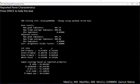 Сам диапазон яркости оказался уже, чем у проверенного нами ранее AW2521H, но это не мешает ему соответствовать запросам для большинства рабочих условий. К тому же, активация HDR режима приводит к увеличению максимальной яркости до уровней 463-465 нит. То есть подсветка способна на большее, просто для SDR режимов производитель слегка ограничил её возможности.