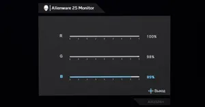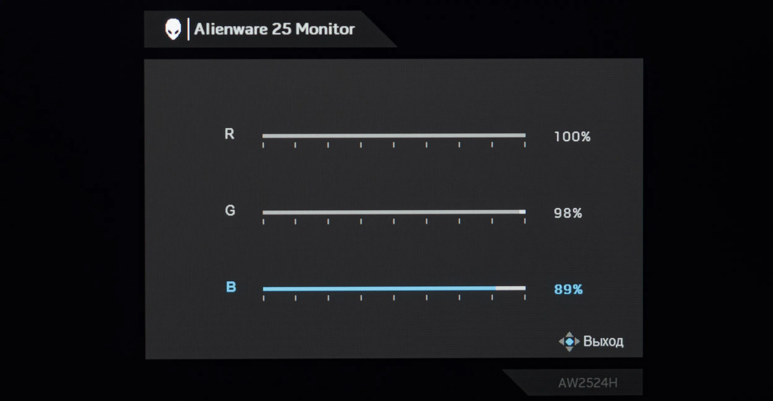 Режим эмуляции sRGB у монитора отсутствует (нет реальной необходимости, учитывая основную направленность AW2524H), а при переходе к изученным пресетам G-Sync eSports и Game (1/2/3) цветовой охват остаётся на изначальном уровне – не урезается. Ручная же настройка и последующая калибровка фактически не влияют на максимальные возможности матрицы – результат меняется в пределах погрешности измерений.
