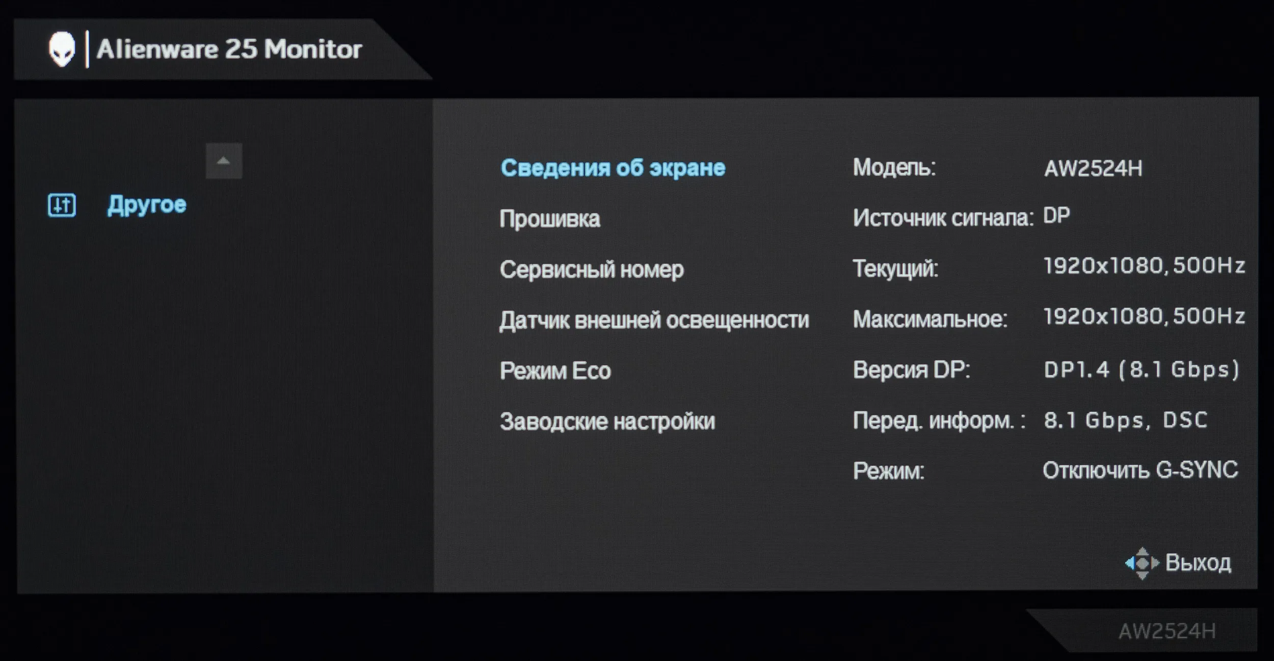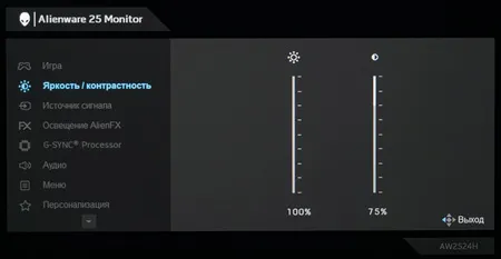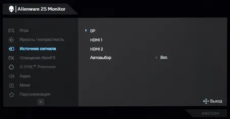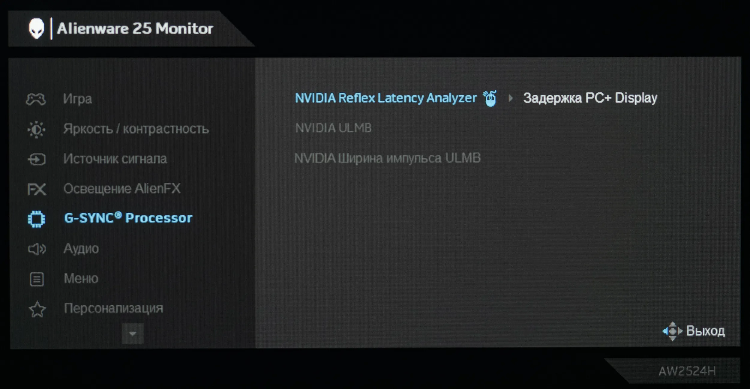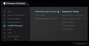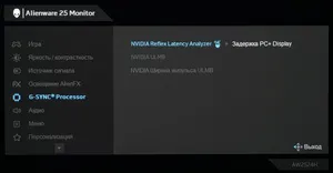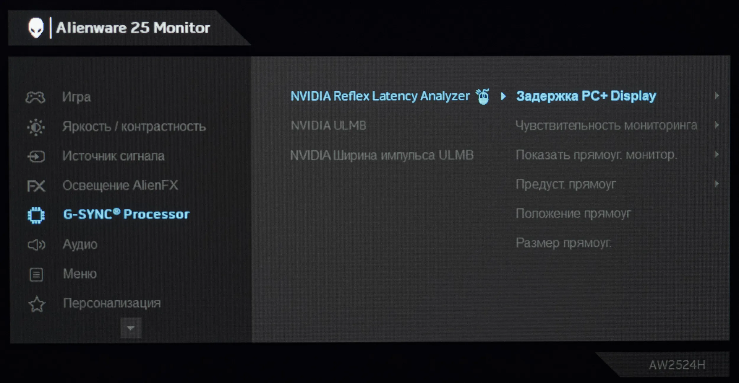 Являясь максимально продвинутым игровым решением, герой обзора использует аппаратный модуль NVIDIA G-Sync с широким рабочим диапазоном от 24 до 500 Гц (и 240-250 при HDMI-подключении), а в качестве важного функционального дополнения в AW2524H присутствует система оценки инпут-лага NVIDIA Reflex Latency Analyzer, работающая, впрочем, исключительно с сертифицированными игровыми манипуляторами.