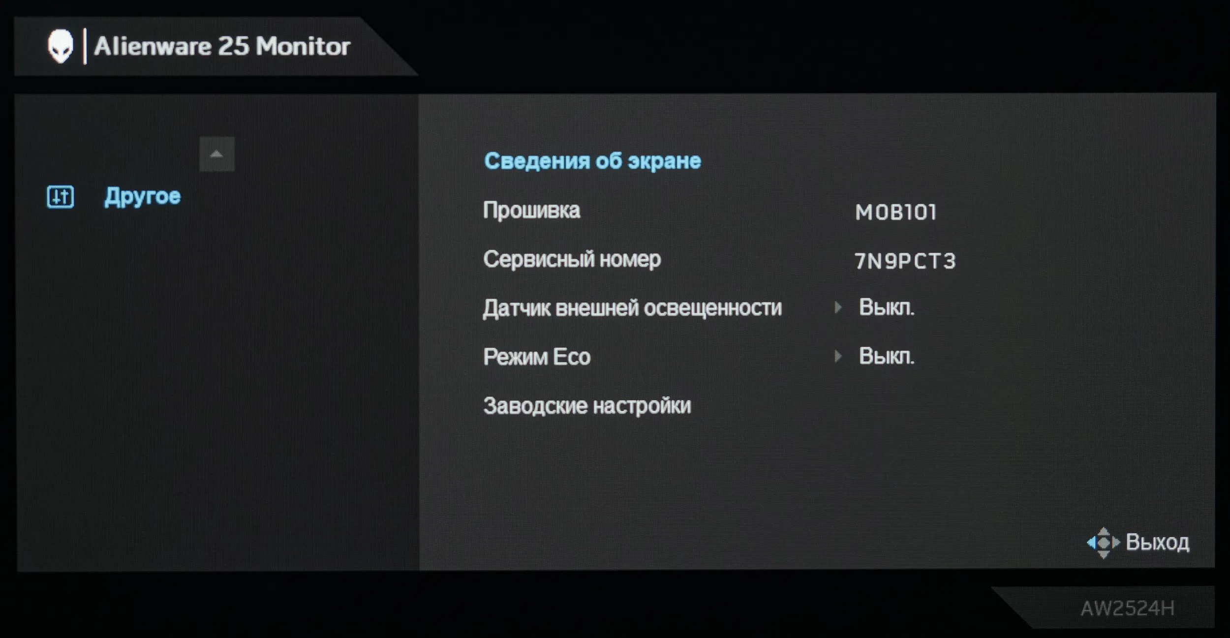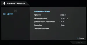 Раздел Others (Другое) позволяет посмотреть версию прошивки, сервисный номер, другую рабочую информацию по монитору в отдельной вкладке «Display Info», дезактивировать Эко-режим и включить датчик внешней освещённости. Опция Factory Reset сбрасывает все (!) настройки к заводским установкам.