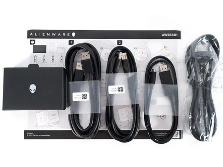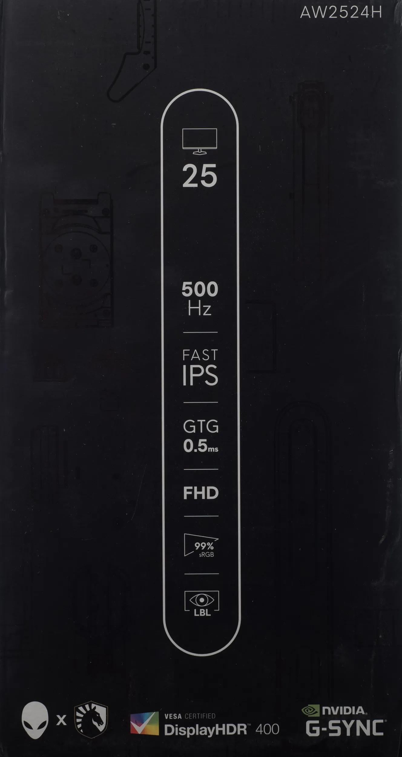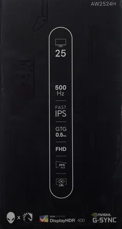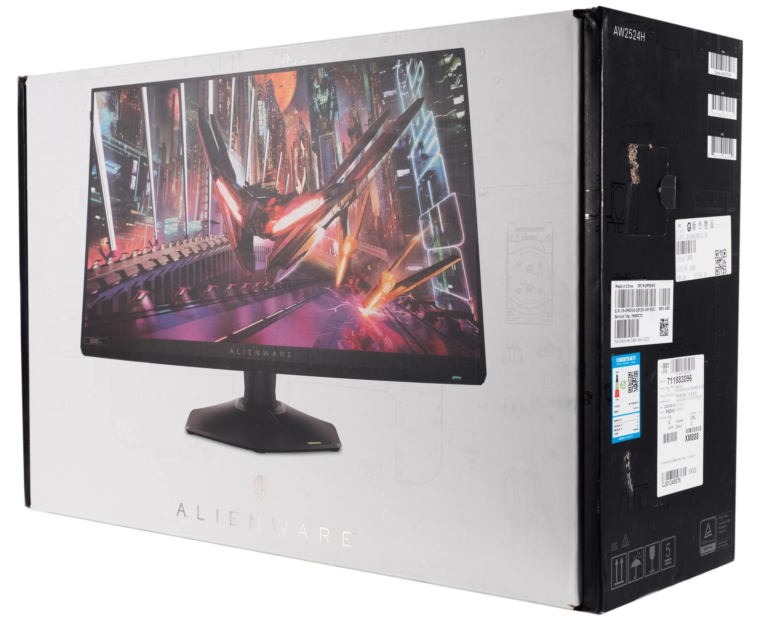 Монитор Dell Alienware AW2524H упакован в достаточно большую коробку (для его габаритов так уж точно), с качественной полиграфией, несколькими фотографиями дисплея с основных ракурсов и упоминанием самых важных отличительных черт.
