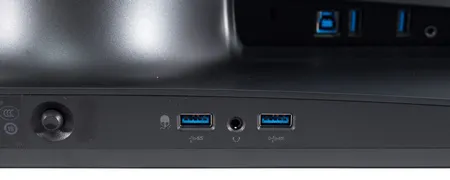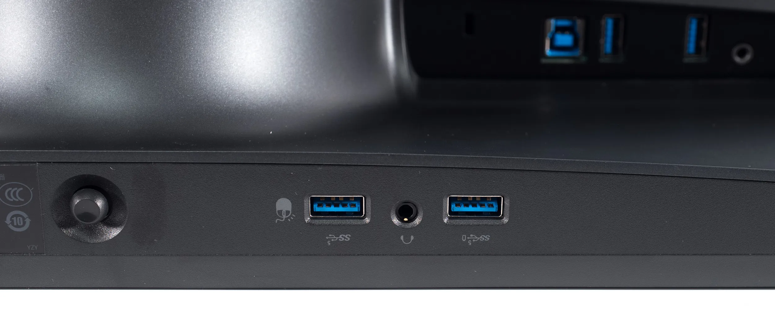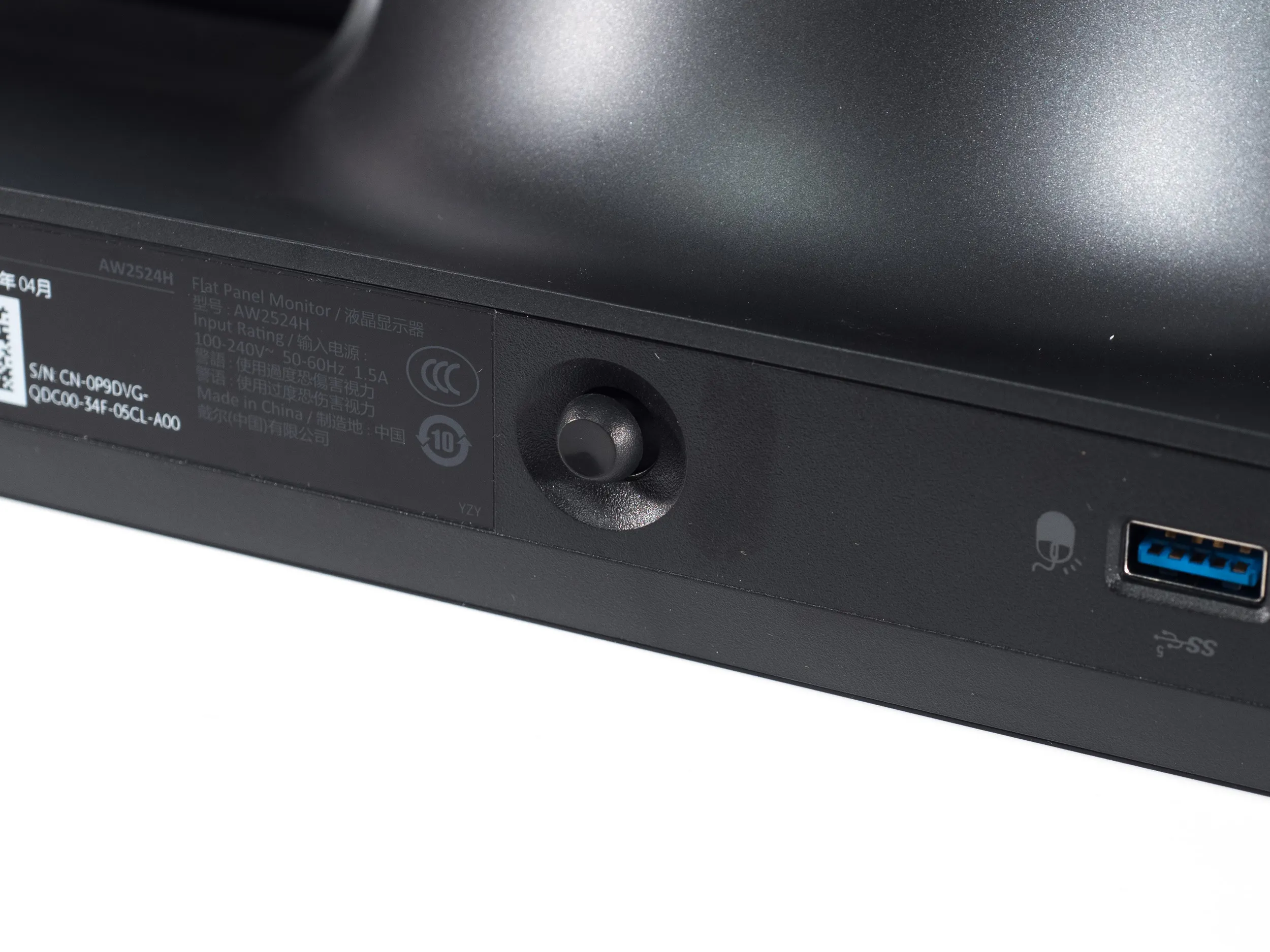 Ещё два USB 3.2 для работы с периферией и 3,5 мм аудиовыход удобно расположились на нижней грани корпуса Dell Alienware AW2524H и смещены влево от 5-позиционного джойстика управления.