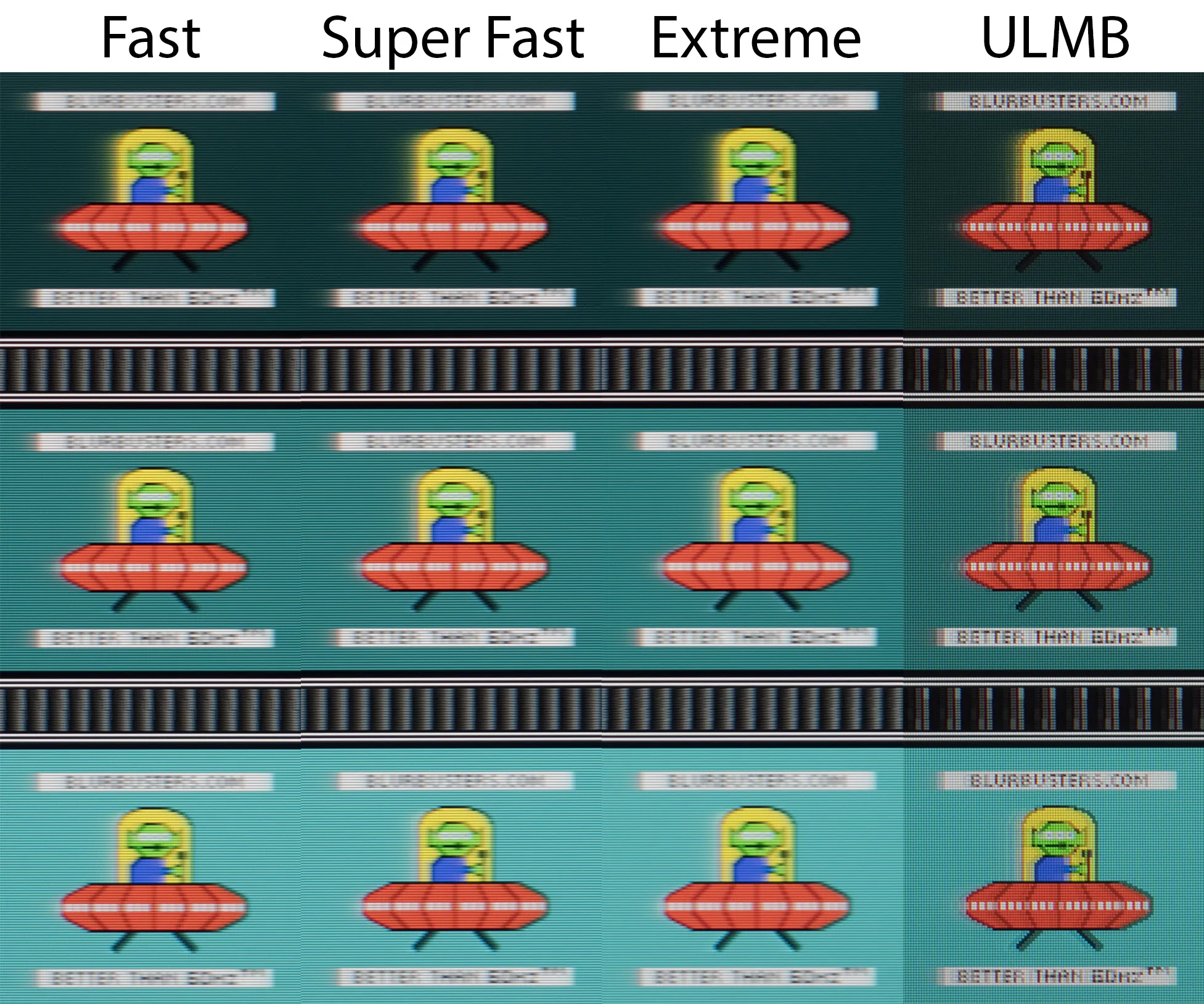У монитора доступно три режима Overdrive. По умолчанию производитель установил режим Fast – первый в списке. Посмотрим на полученные результаты при максимальной частоте развёртки и различными вариантами OD, а также с включенной «системой вставки чёрного кадра» ULMB на максимально доступной для него частоте в 360 Гц:
