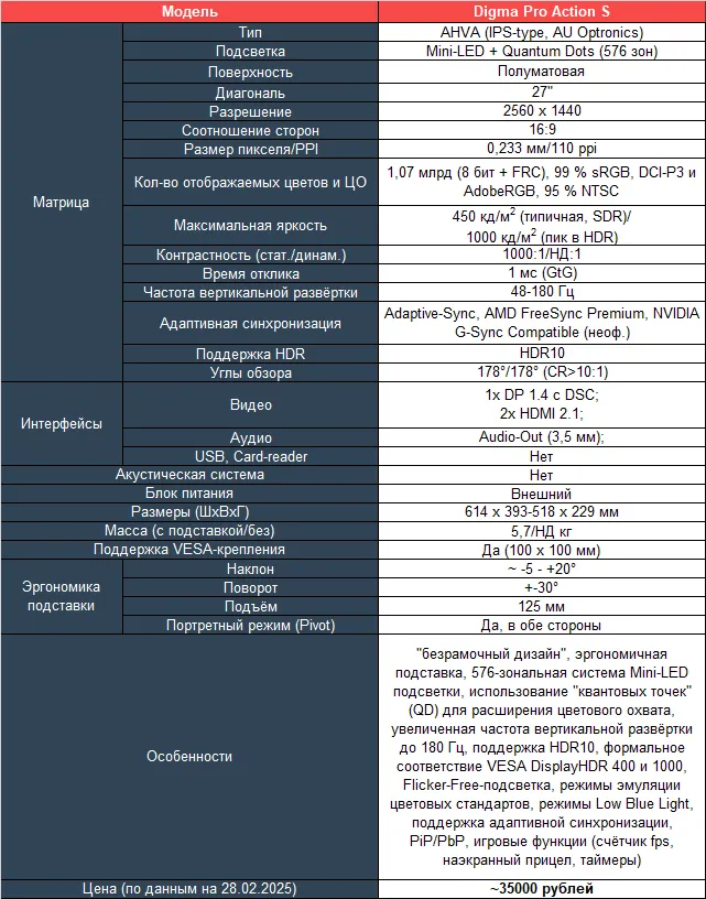 Новинка Digma Pro Action S была анонсирована в конце 2024 года, а появилась в продаже в конце января 2025 года. Рекомендованная розничная цена (РРЦ) составила 35990 рублей, что сразу же сделало новинку крайне привлекательной в глазах многих покупателей, поскольку как такового разнообразия Mini-LED решений в изучаемом классе практически нет.