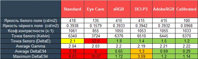 В свою очередь, при переходе к основному режиму для снижения нагрузки на глаза под названием Eye Care, монитор возвращается к широкому цветовому охвату, а общие результаты оказываются несколько ниже, чем при заводских настройках, что было предполагаемо, ведь пресет не предусмотрен для работы с цветом. А поэтому — ему простительно.