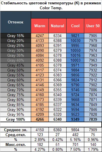 Вместе с тем удивляет высокая стабильность ЦТ по серым оттенкам в любом из проверенных режимов. В некоторых из них лишь увеличивается максимальное отклонение, но на общем фоне — это мелочи. Даже сниженный результат после калибровки остался высоким — вот это уровень!