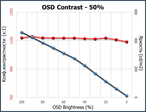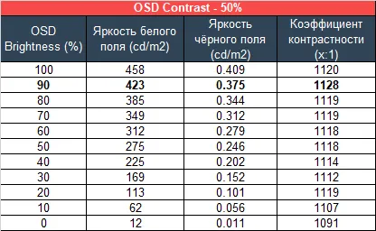 Для изучения стабильности контрастности и диапазона изменения яркости был выставлен режим Standard с полным цветовым охватом. Значение Brightness менялось с 100 до 0% с шагом в 10 единиц. Для представленной ниже таблицы измеренные значения были получены через программу HCFR, которая даёт возможность более точно оценить уровень чёрного (три знака после запятой) и соответственно определить достоверный коэффициент контрастности.