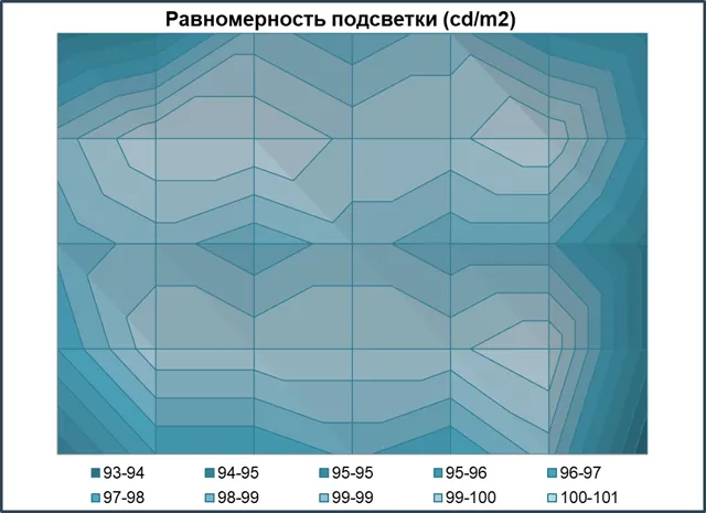 Равномерность подсветки дисплея проверялась после снижения яркости в центральной точке монитора до уровня 100 кд/м2 и установки цветовой температуры в ~6500 кельвин. Система компенсации неравномерности в модели не применяется, но есть функция управления локальной подсветкой (LD — Local Dimming), которую мы проверим в конце данного подраздела тестирования.