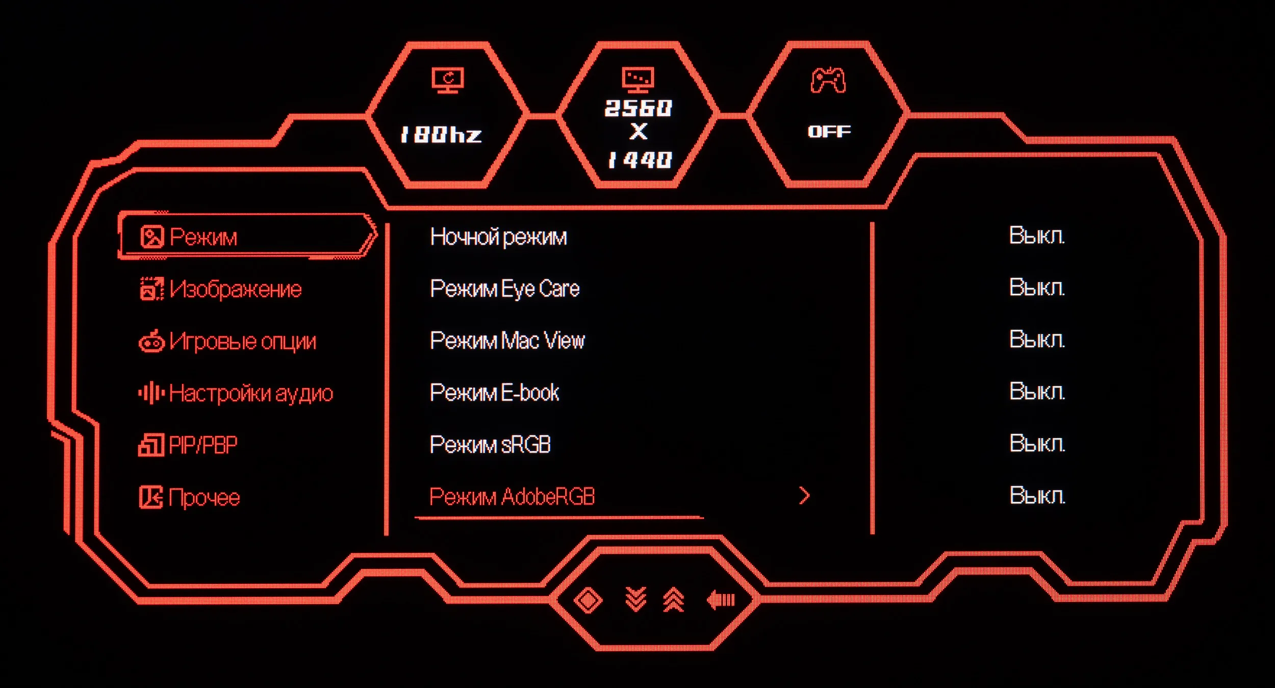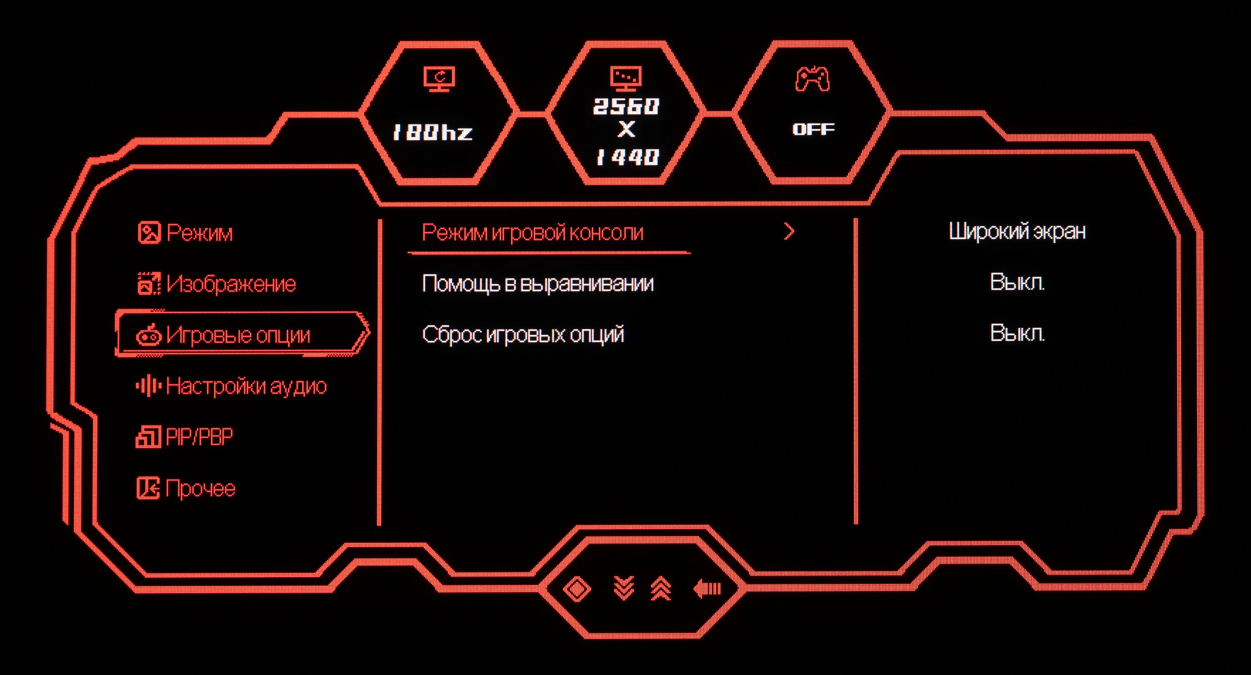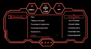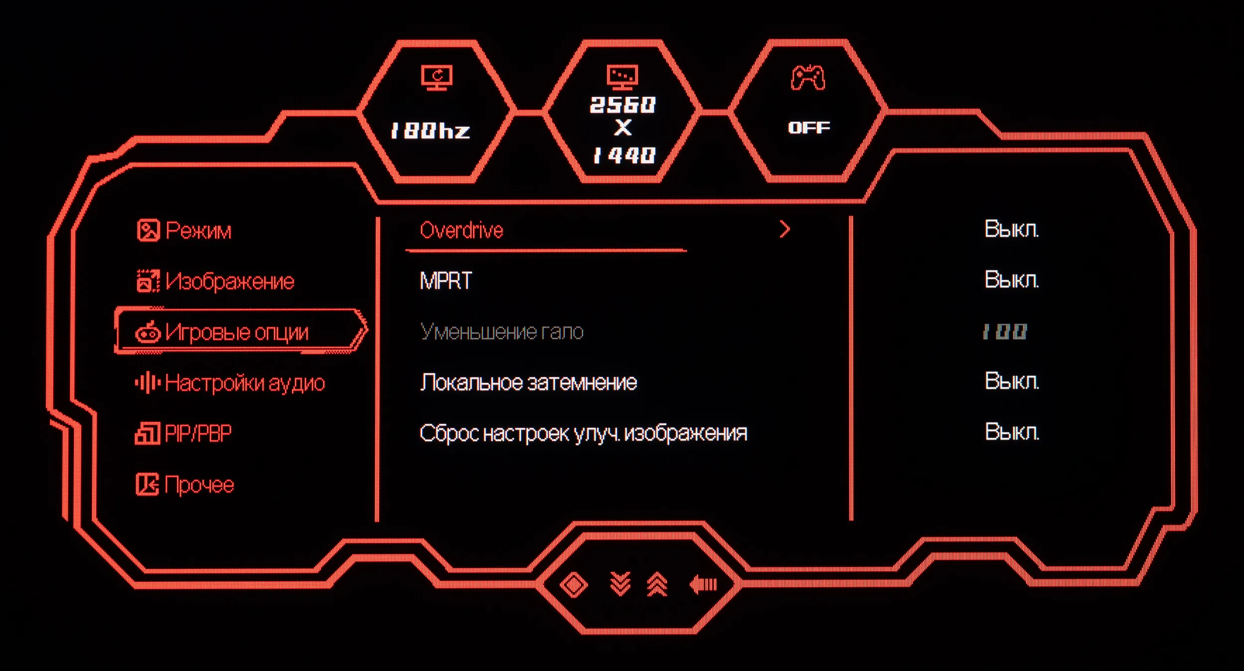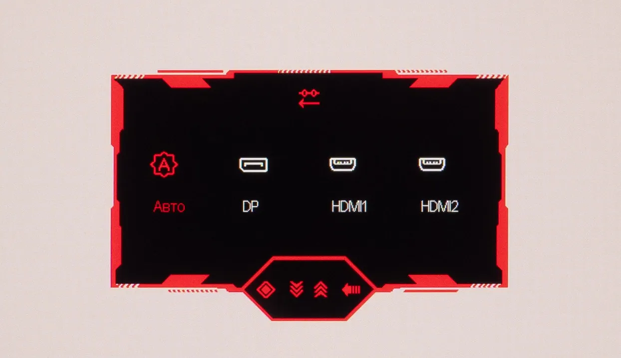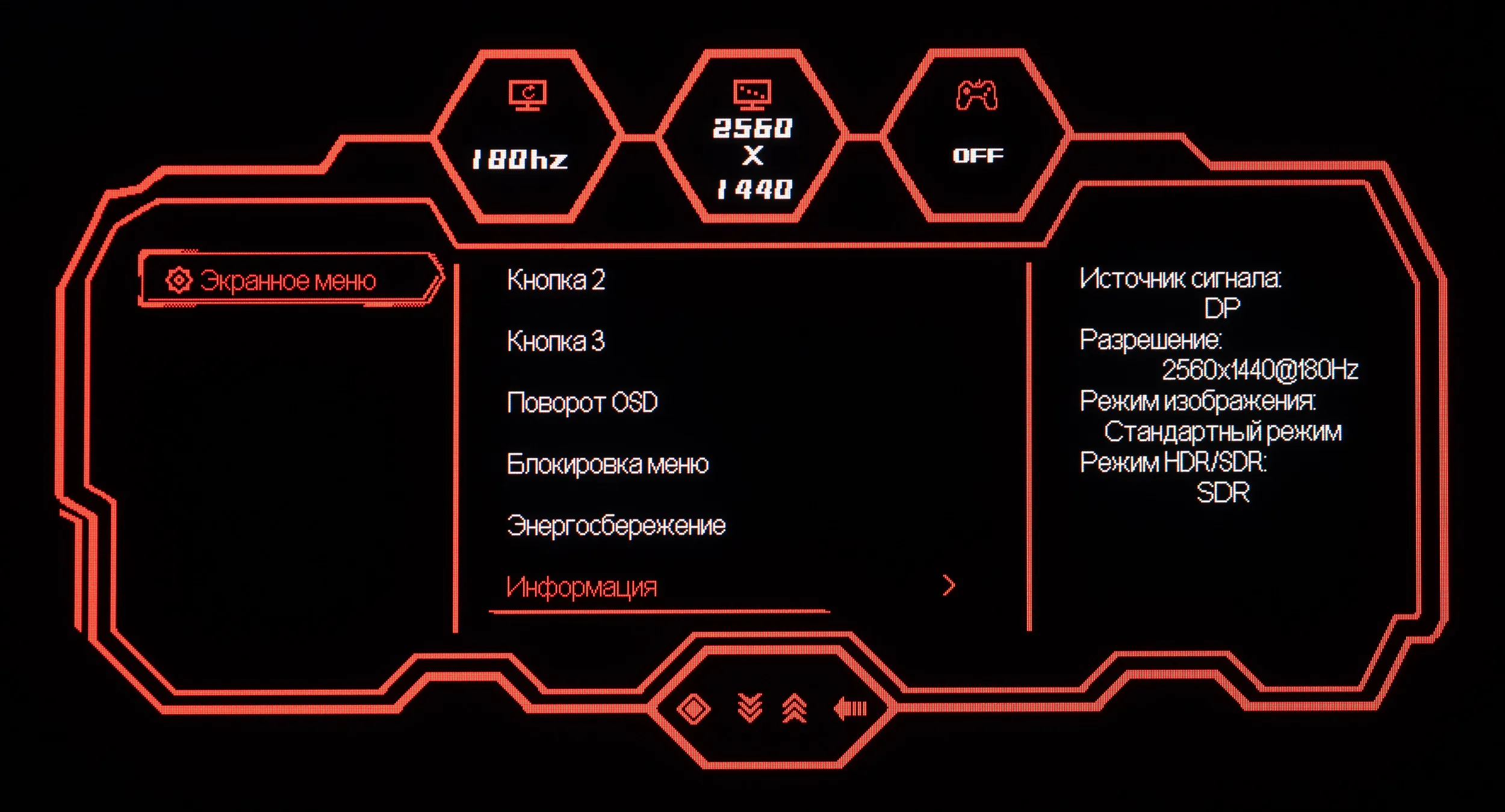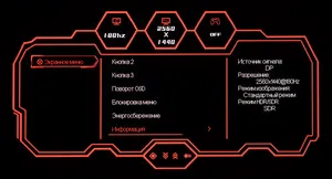 Визуальное оформление OSD-меню нельзя назвать впечатляющим. Оно выполнено в чёрно-красной цветовой гамме и включает три информационных сегмента в верхней части и один нижний сегмент с подсказками по работе с системой управления. Хотя функциональность меню достаточная, его дизайн и эргономика оставляют простор для улучшений, особенно учитывая современные стандарты пользовательского интерфейса в подобных устройствах.