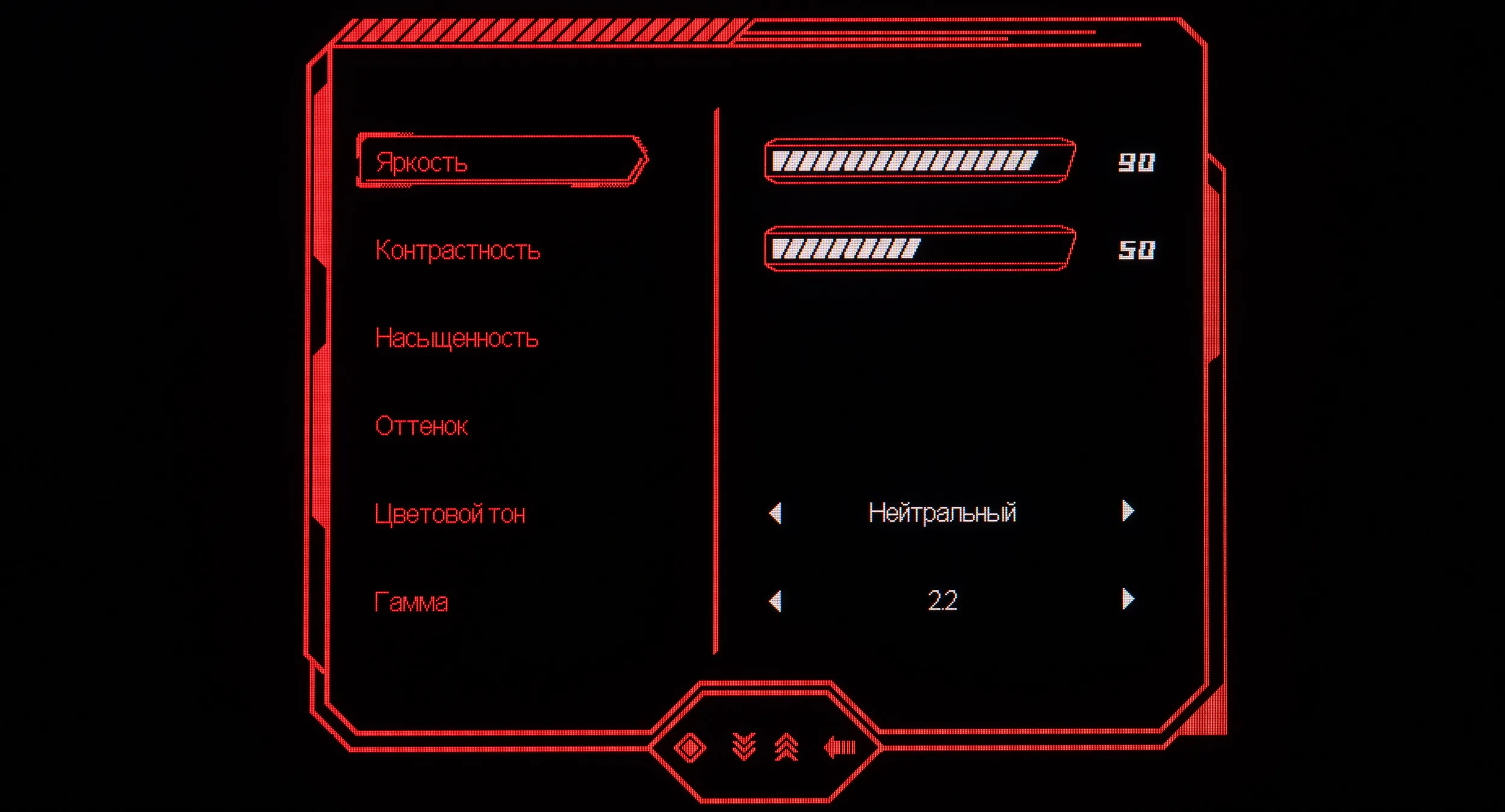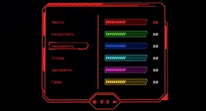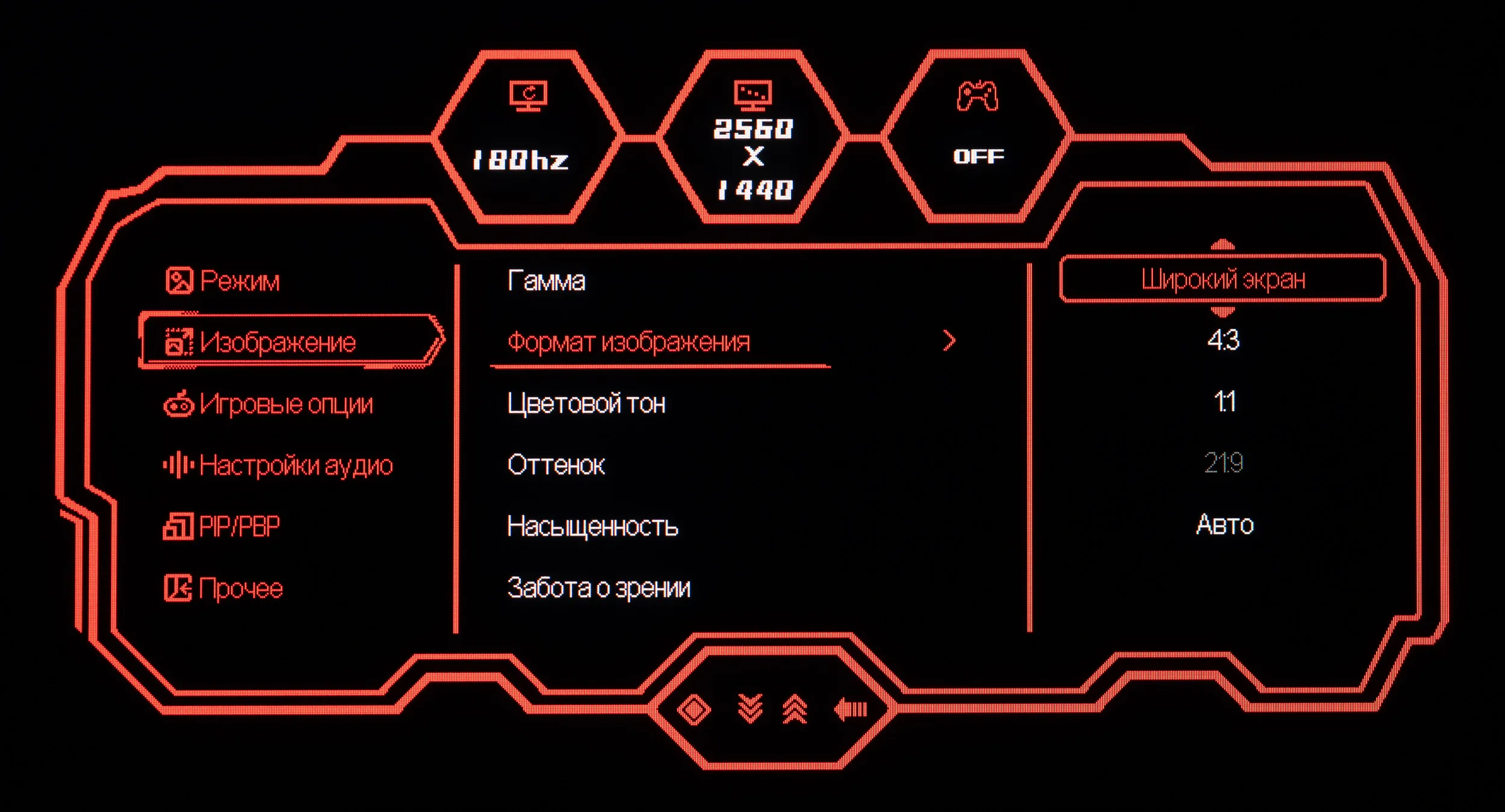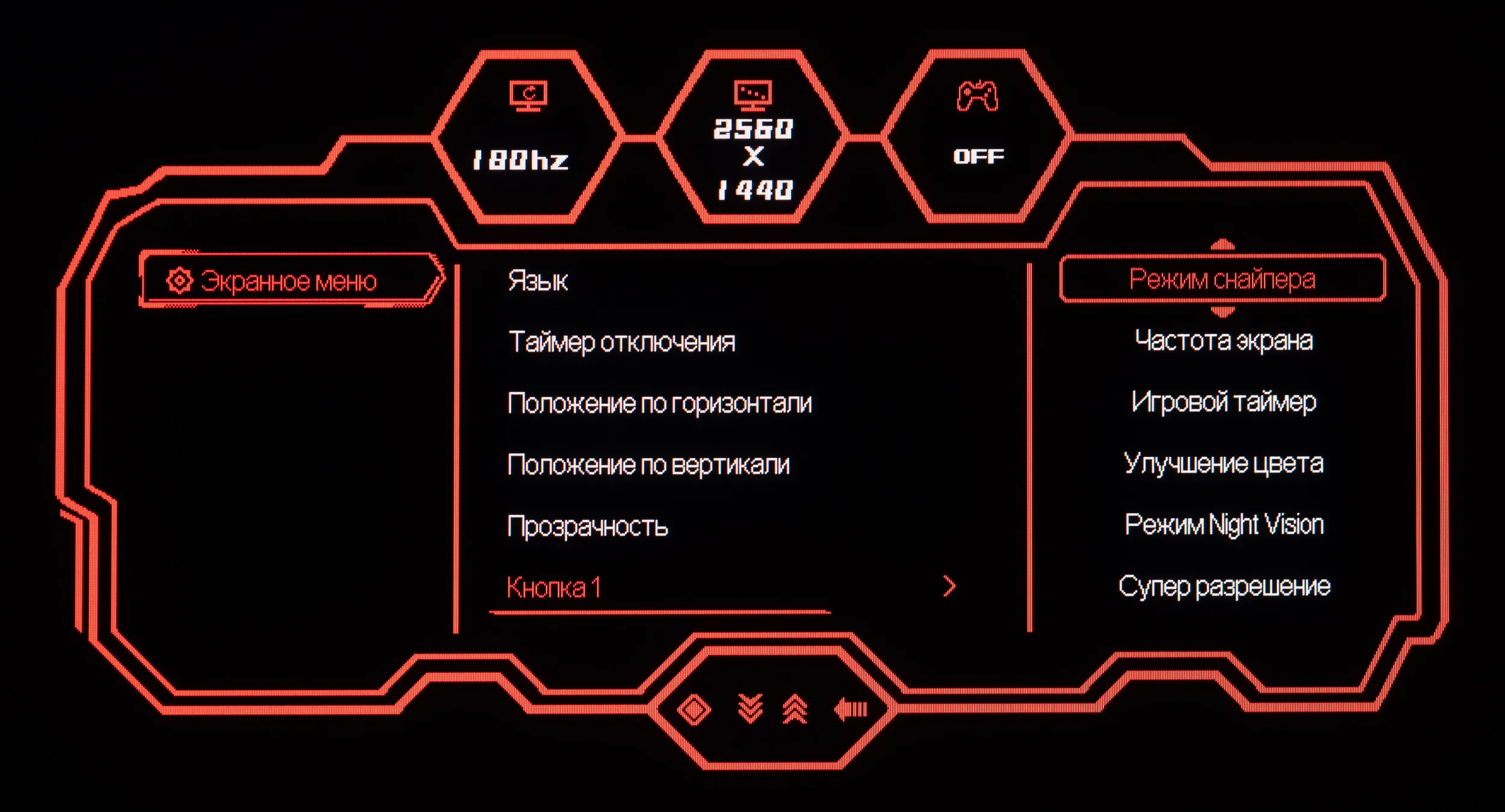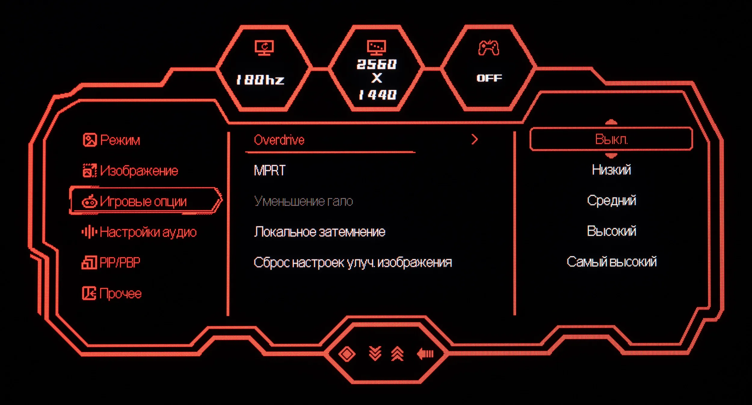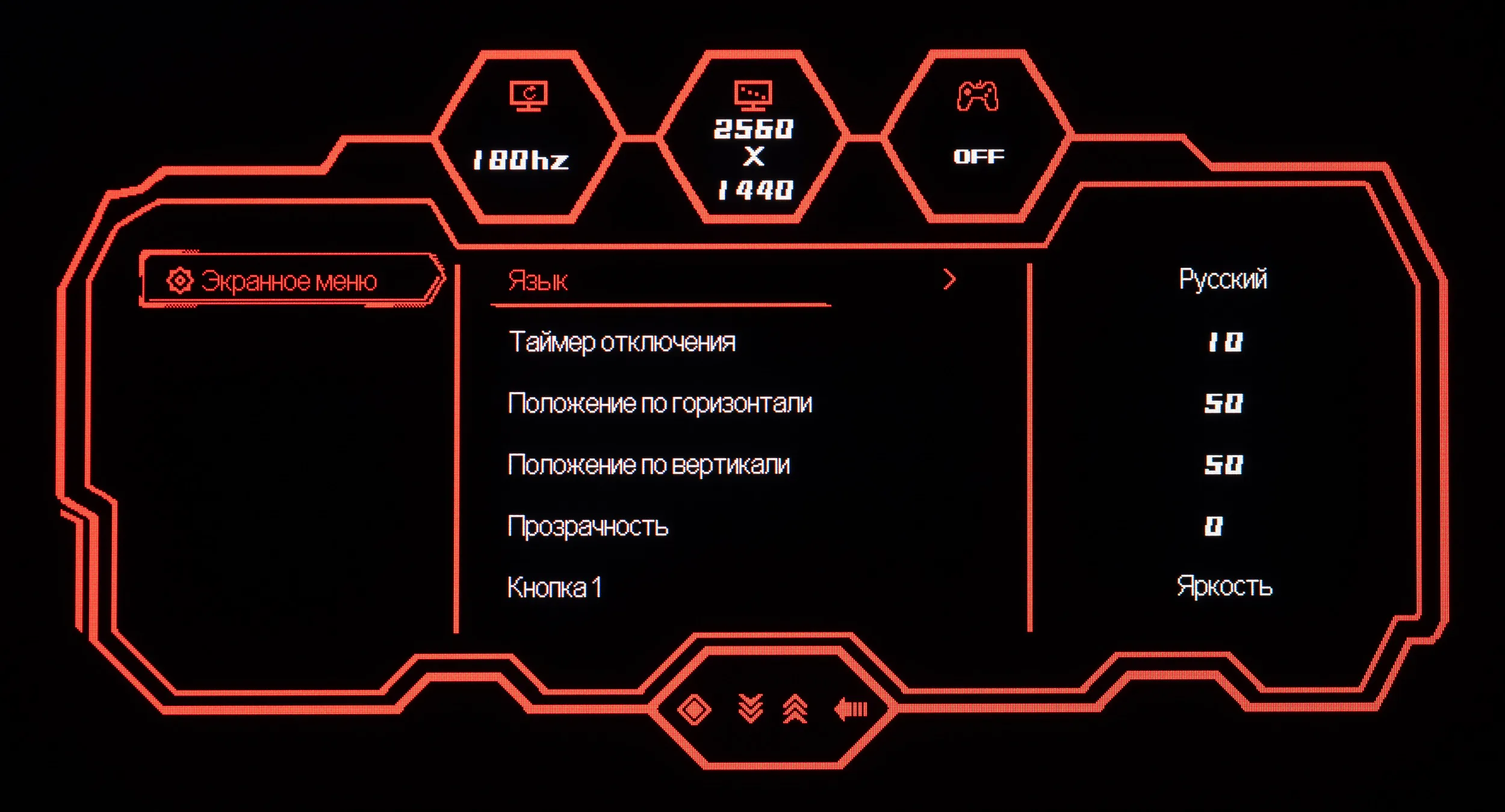 Визуальное оформление OSD-меню нельзя назвать впечатляющим. Оно выполнено в чёрно-красной цветовой гамме и включает три информационных сегмента в верхней части и один нижний сегмент с подсказками по работе с системой управления. Хотя функциональность меню достаточная, его дизайн и эргономика оставляют простор для улучшений, особенно учитывая современные стандарты пользовательского интерфейса в подобных устройствах.