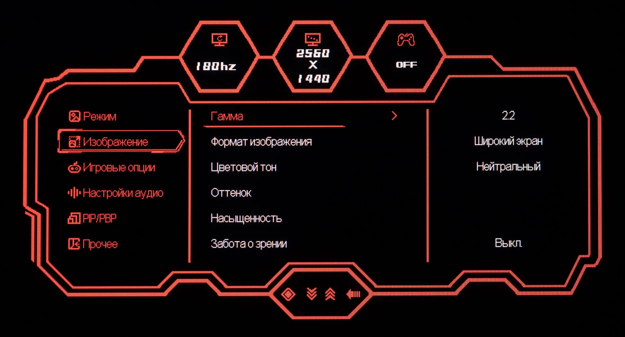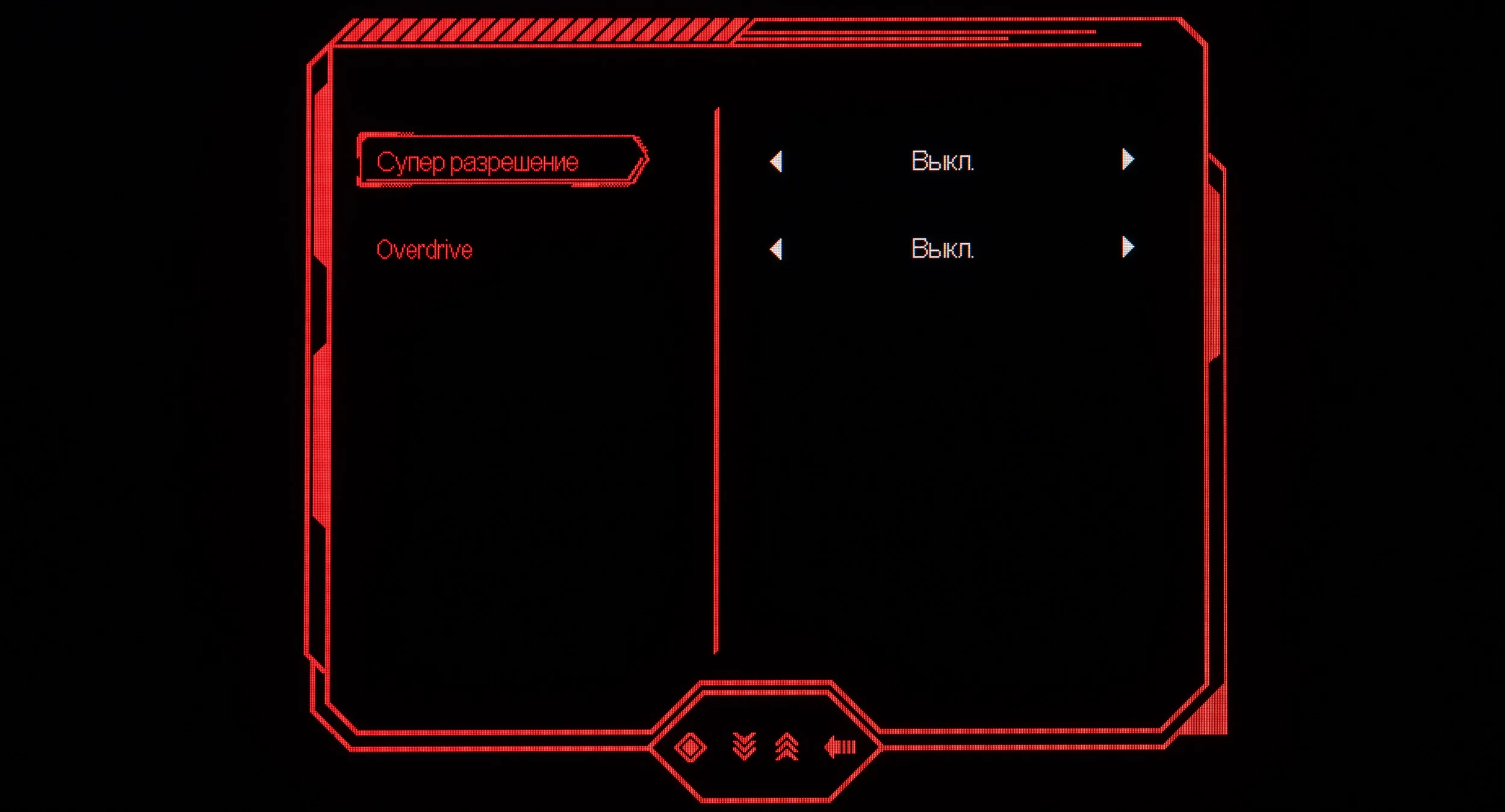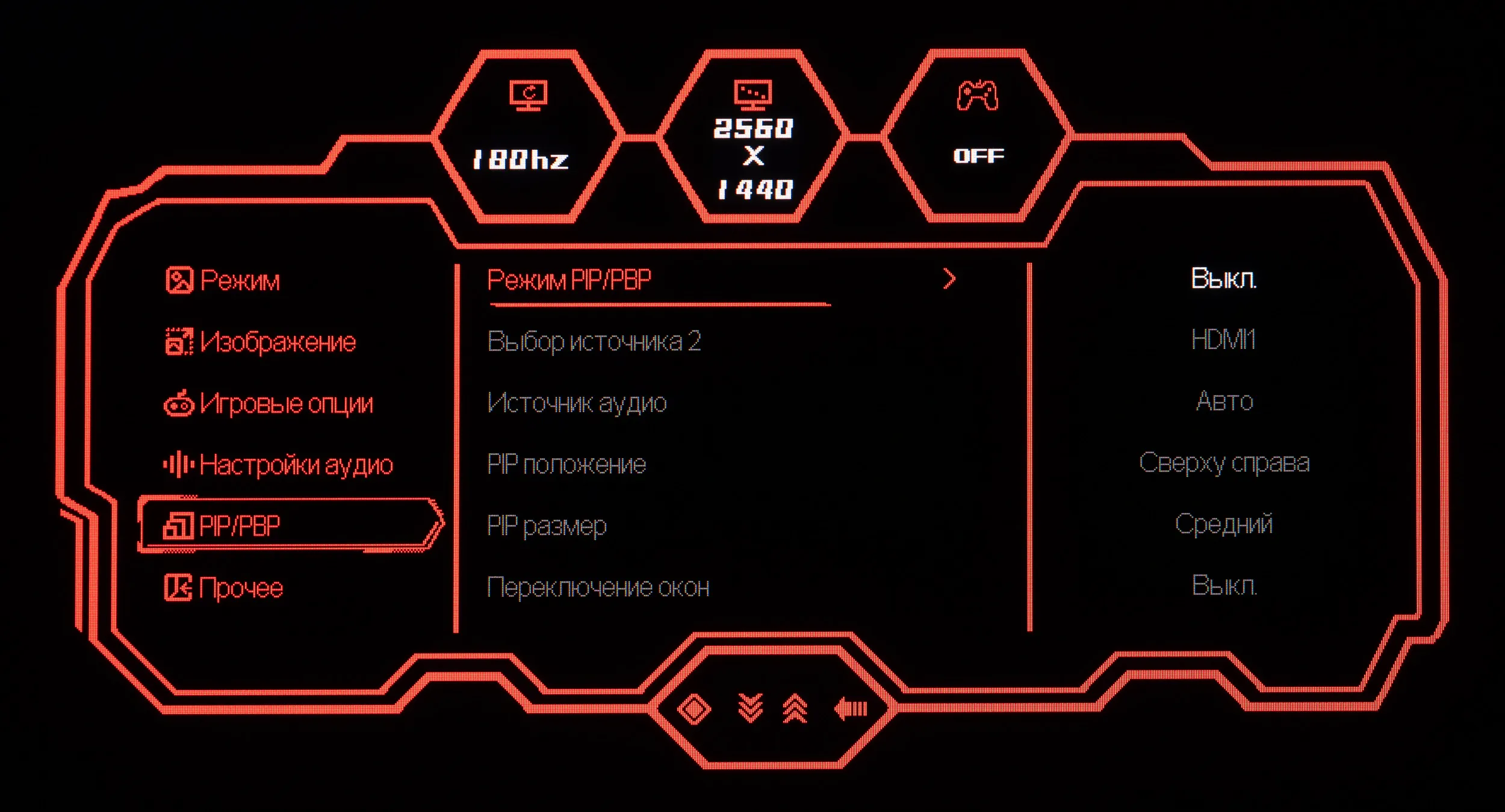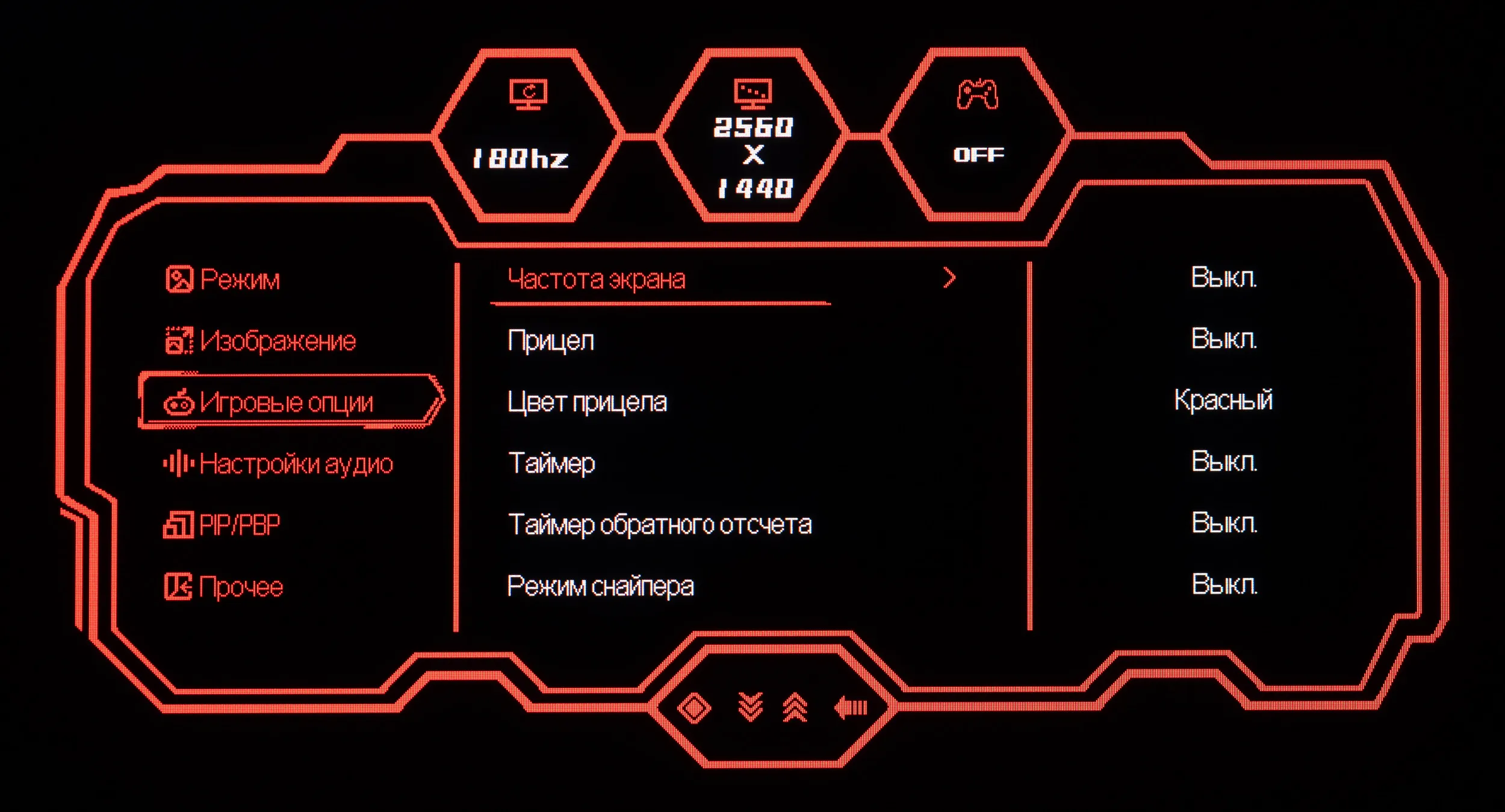 Визуальное оформление OSD-меню нельзя назвать впечатляющим. Оно выполнено в чёрно-красной цветовой гамме и включает три информационных сегмента в верхней части и один нижний сегмент с подсказками по работе с системой управления. Хотя функциональность меню достаточная, его дизайн и эргономика оставляют простор для улучшений, особенно учитывая современные стандарты пользовательского интерфейса в подобных устройствах.