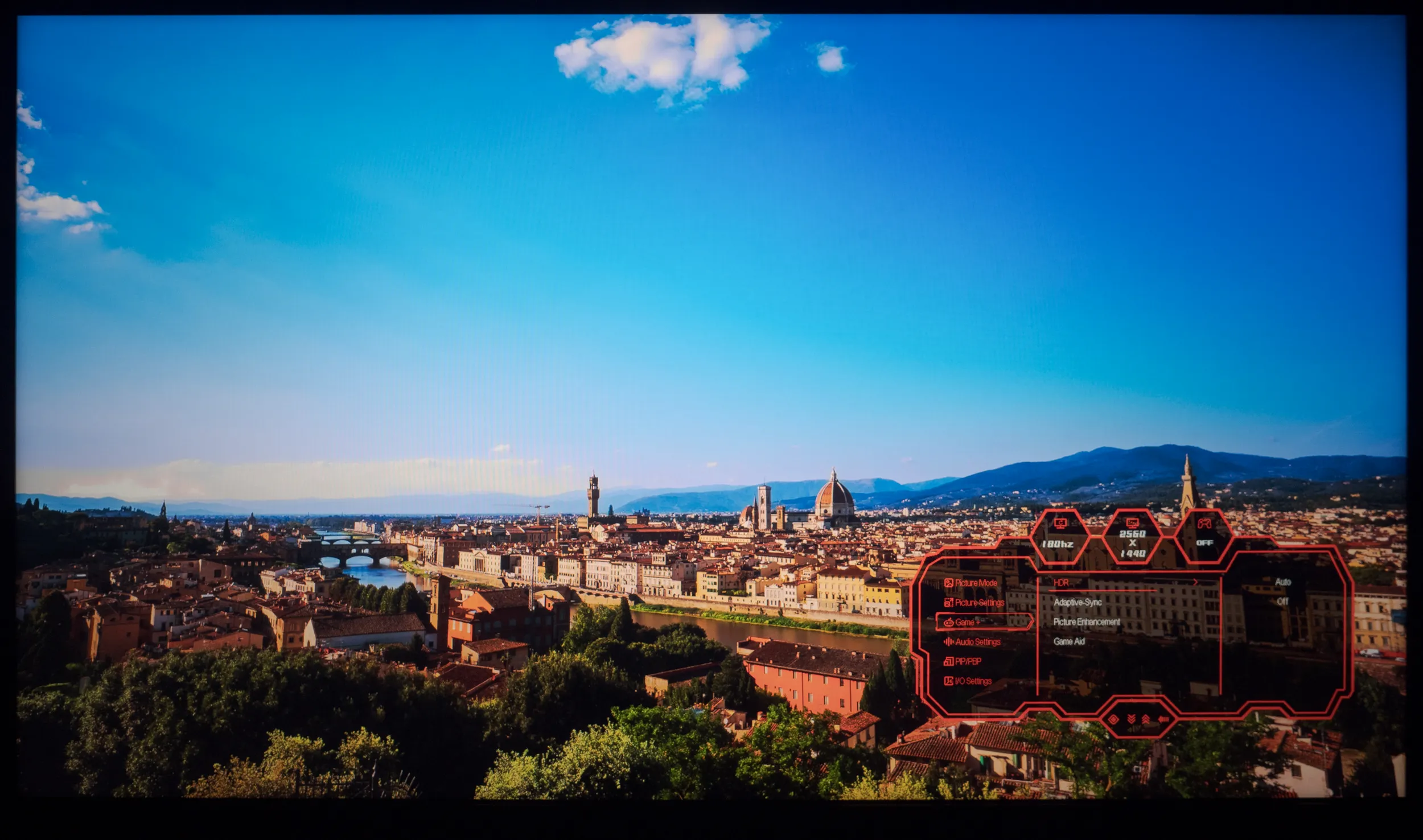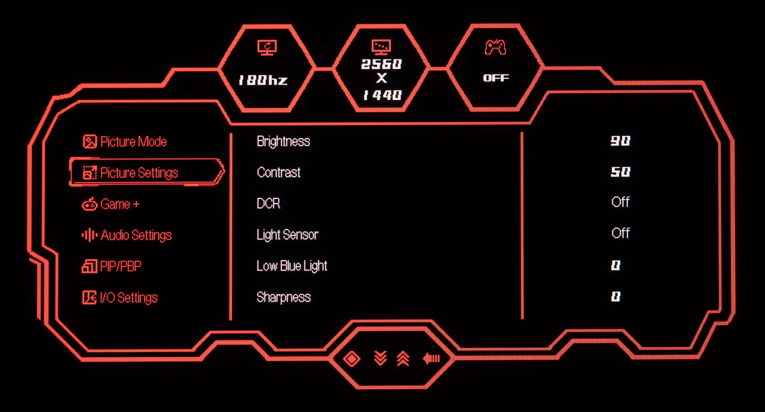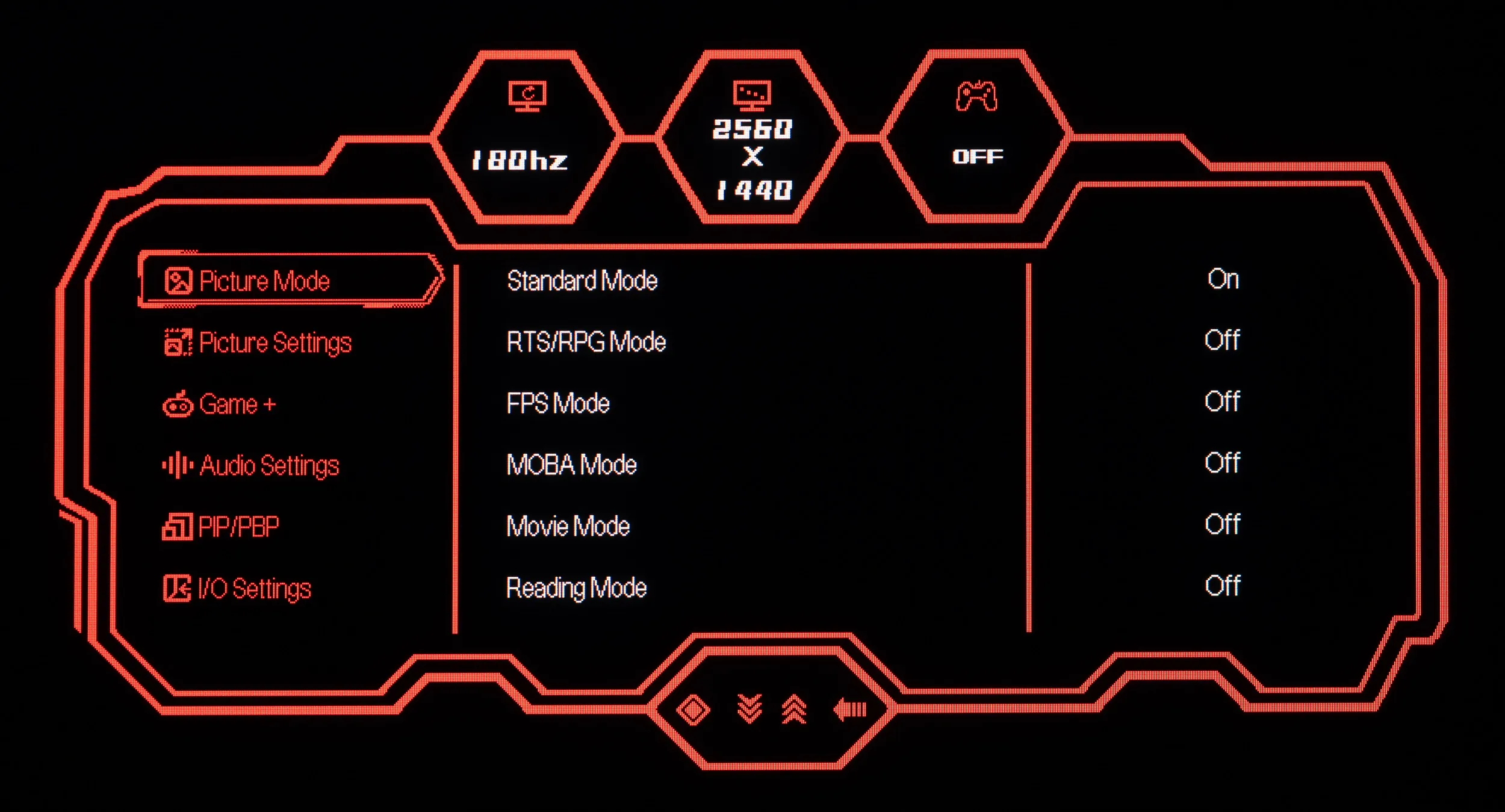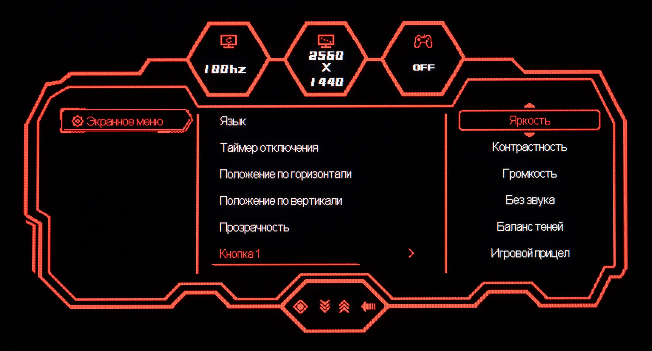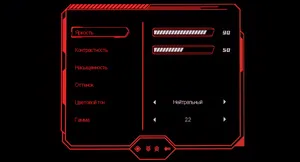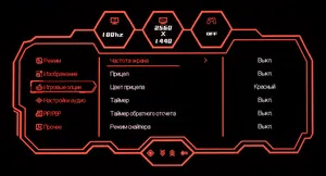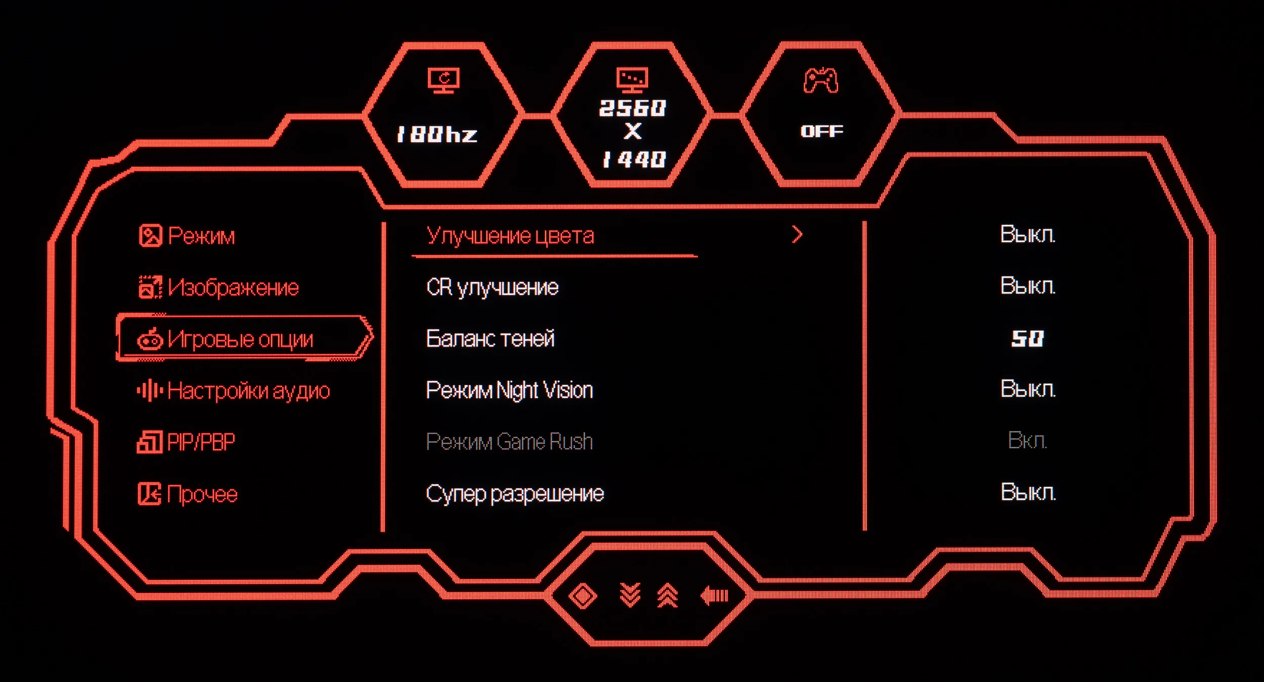 Визуальное оформление OSD-меню нельзя назвать впечатляющим. Оно выполнено в чёрно-красной цветовой гамме и включает три информационных сегмента в верхней части и один нижний сегмент с подсказками по работе с системой управления. Хотя функциональность меню достаточная, его дизайн и эргономика оставляют простор для улучшений, особенно учитывая современные стандарты пользовательского интерфейса в подобных устройствах.