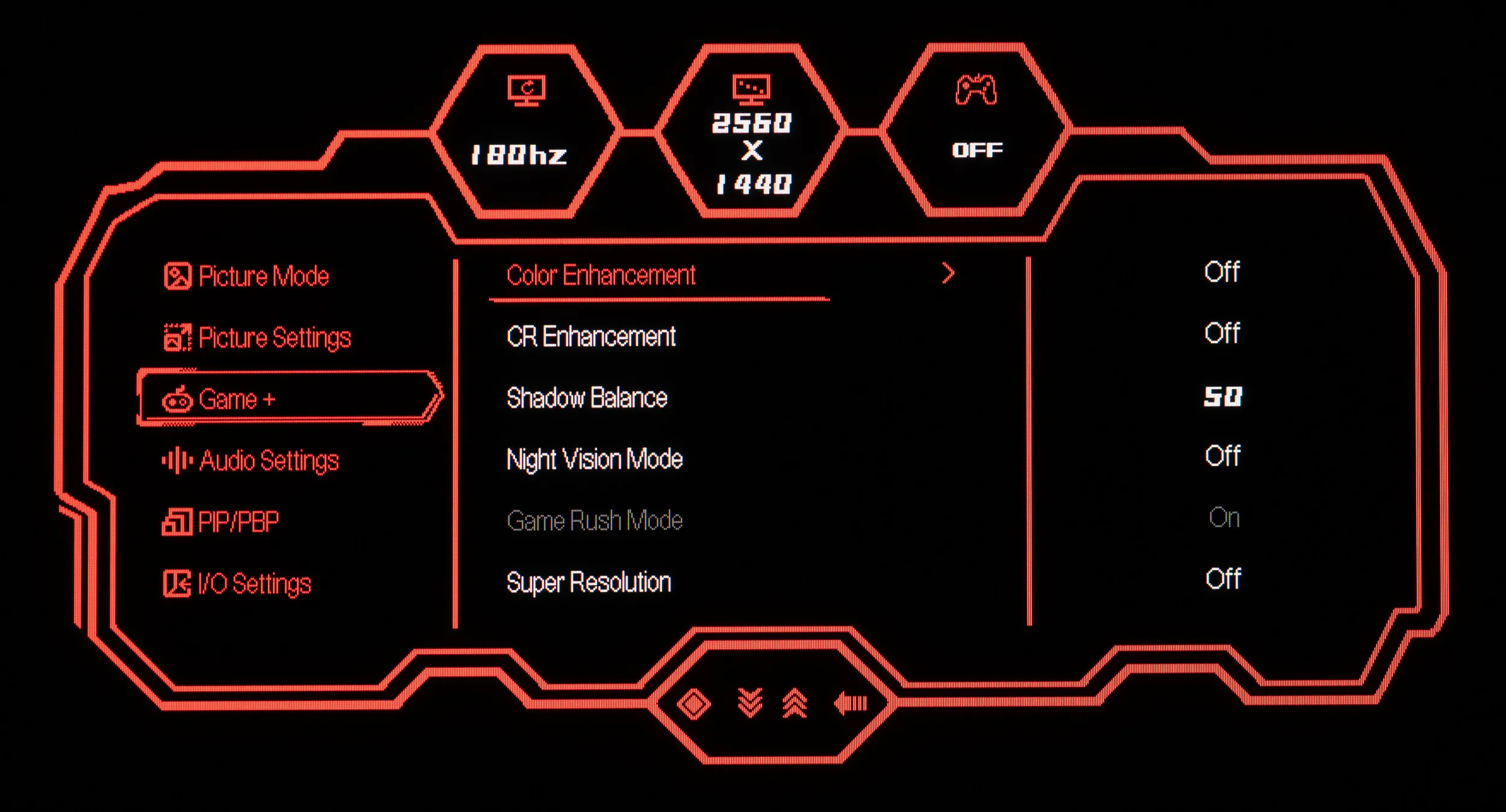 В новинке используется скоростная AHVA-панель производства AU Optronics c максимальной нативной частотой развёртки 180 Гц и заявленным временем отклика 1 мс по стандарту GtG. Подобное сочетание скоростных характеристик знакомо рынку 27-дюймовых игровых WQHD ещё с 2018 года, а поэтому в данном вопросе никаких значимых изменений за прошедшие 7 лет не произошло. Безусловно, большая часть матриц стала лучше в вопросах скорости отклика, но общая плавность никак не поменялась (а они зависит исключительно от максимальной частоты обновления).