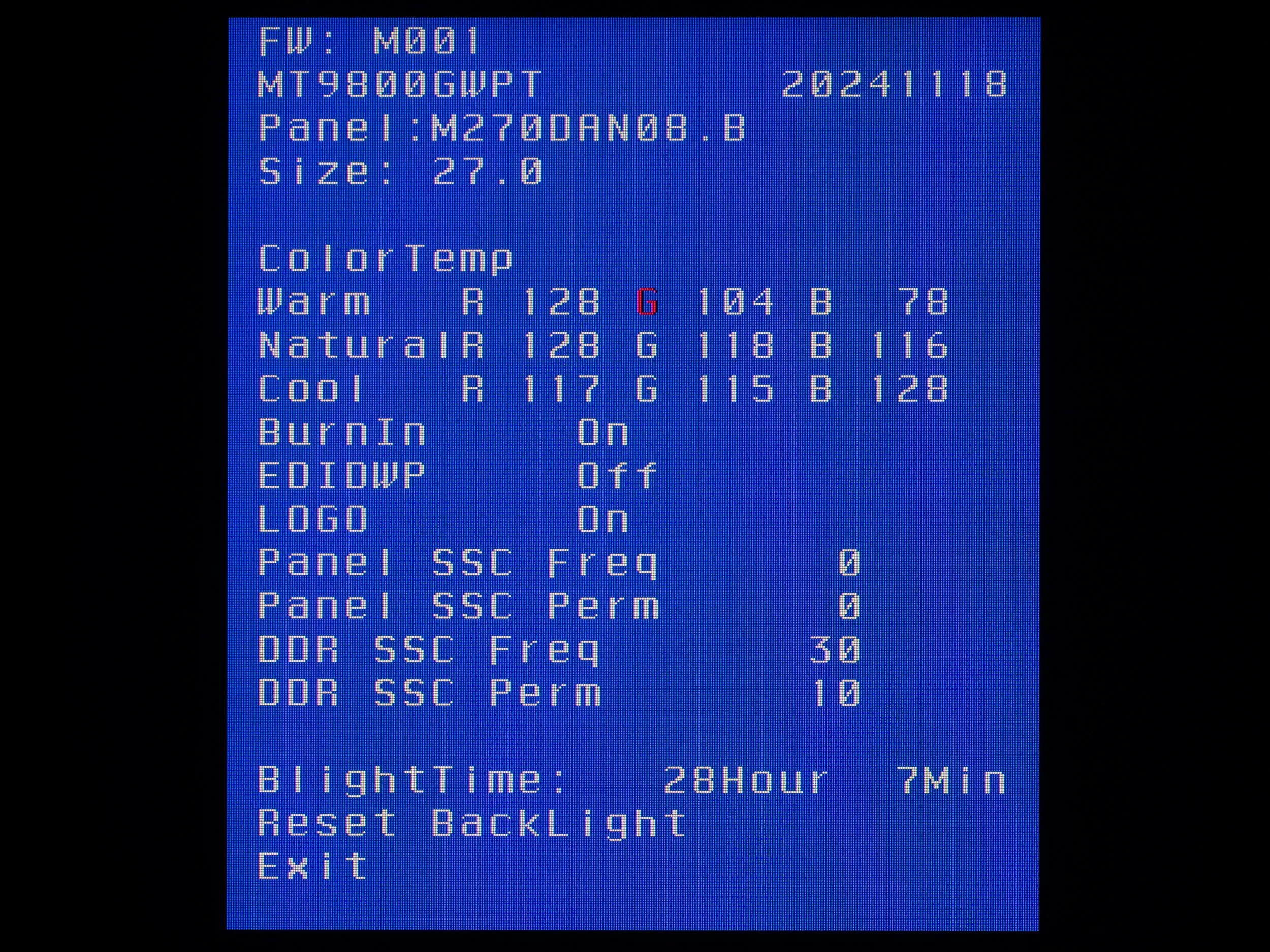 Сервисное меню монитора открывается при установке яркости на 88% и удержании второй клавиши слева. В этом меню доступны технические параметры устройства: версия используемого скалера, информация об установленной панели, точные значения RGB для различных настроек цветовой температуры. Также можно отключить загрузочный логотип и сбросить счетчик времени наработки.