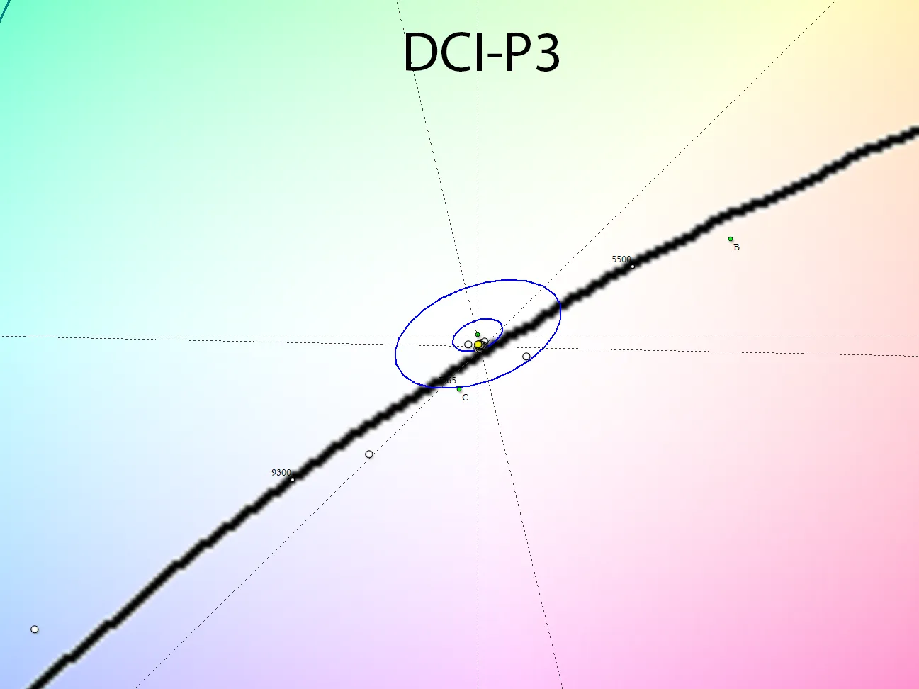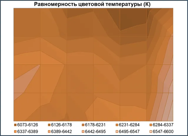 С равномерностью же цветовой температуры дела обстоят похуже: среднее отклонение составило 1,4%, максимальное — 4,3%, но разброс значений по полю экрана не превысил стандартные 600К — это большой плюс.