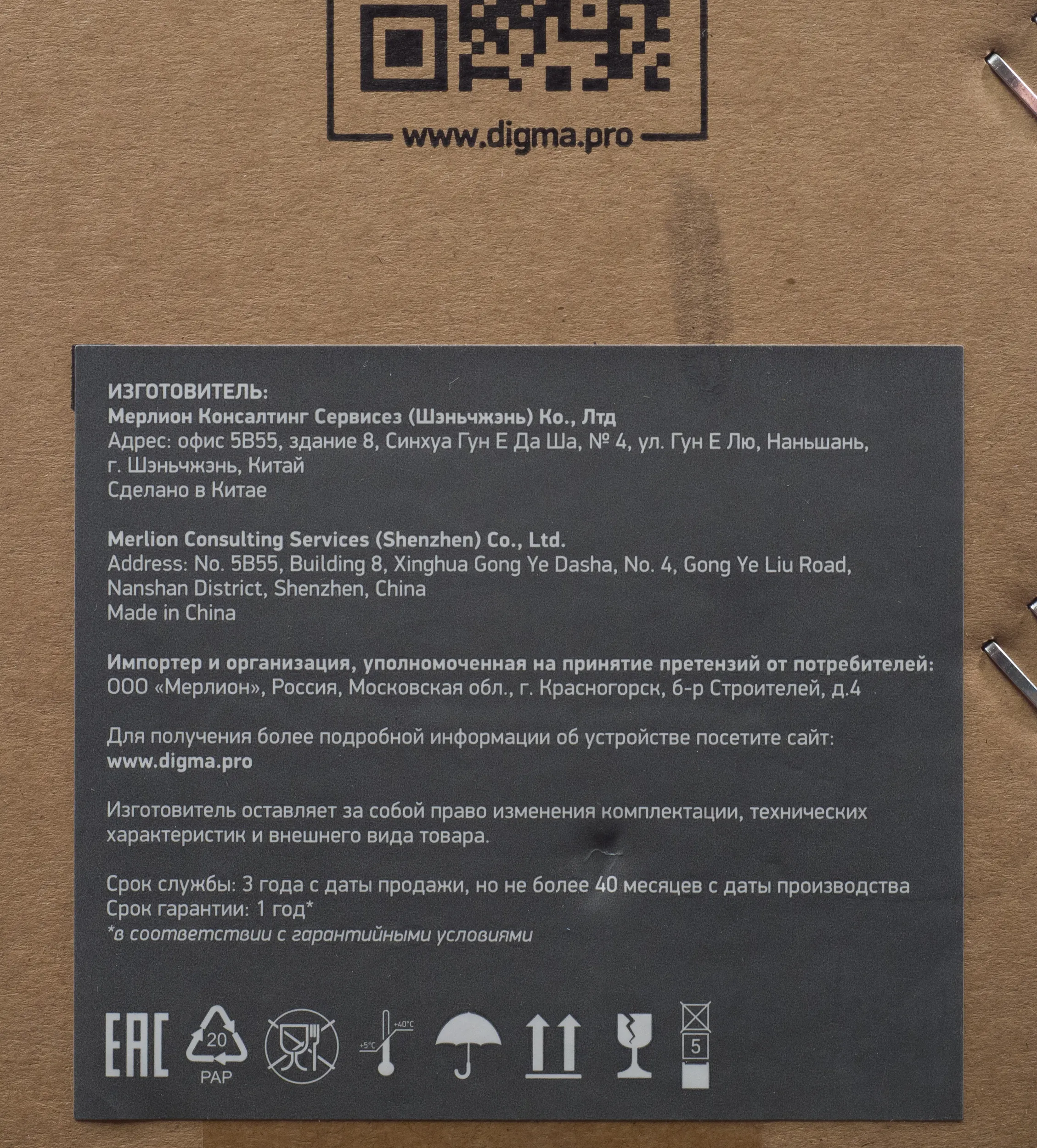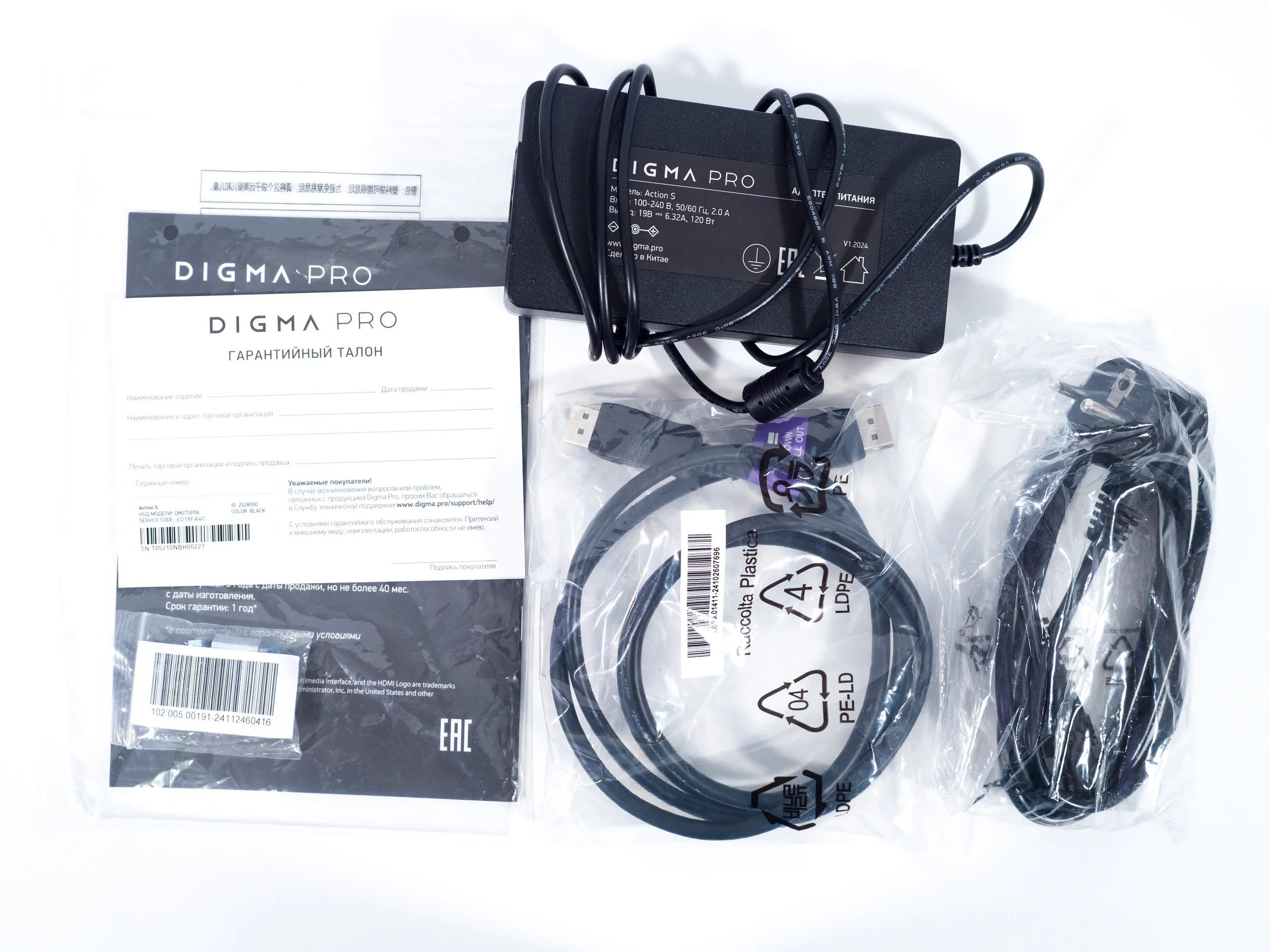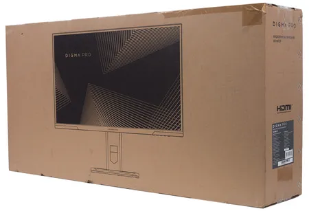 Модель Digma Pro Action S поставляется в крупной коробке из некрашеного картона, на которой размещены два одинаковых изображения монитора. Для удобства транспортировки предусмотрены специальные вырезы по бокам упаковки.