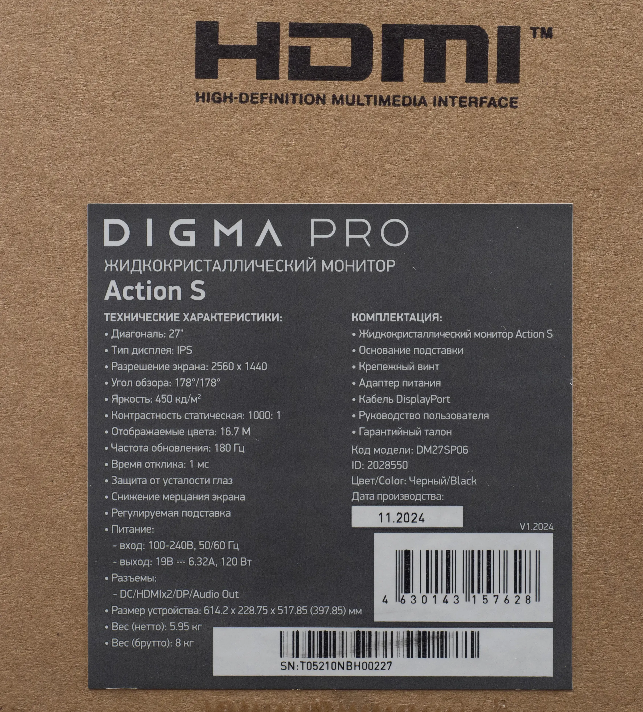 На одной из сторон коробки указаны основные технические характеристики устройства, а также серийный номер, артикул, масса, версия (V1.2024) и дата производства (ноябрь 2024 года).