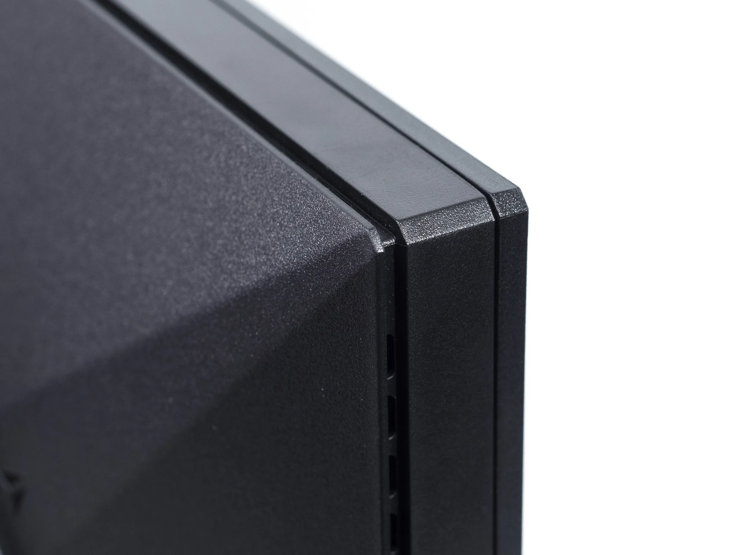 Корпус устройства получился достаточно толстым из-за использования сложной и энергозатратной Mini-LED подсветки. На поверхности расположено множество вентиляционных ламелей для эффективного теплообмена и охлаждения панели и остальной внутренней начинки.
