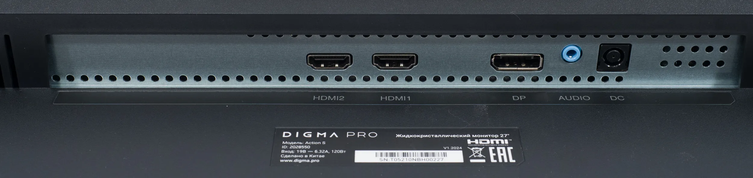 В плане подключения Digma Pro Action S предлагает небольшой набор современных интерфейсов: два порта HDMI 2.1 и один DisplayPort 1.4 с поддержкой DSC. USB-хаб и порт USB Type-C с DP Alt Mode в новинке не представлены. Нет и встроенной акустической системы, которая присутствует в старшем Art M, а вот 3,5 мм аудиовыход никуда не исчез.