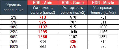 Хорошо видно, что в Auto и Movie на светлых участках присутствуют резкие переходы с чёткими очерченными границами, которые отсутствуют при просмотре того же контента, но в режиме SDR. Убрать данный «дефект» можно с помощью перехода в режим HDR Game, но в таком случае пользователь столкнётся со следующими особенностями: будет ограничена максимальная яркость (напомним, что в Auto она самая высокая в большей части случаев), увеличена резкость (но её можно вернуть в норму), баланс серого смещён в зелёную зону (исправить невозможно), значительно увеличена насыщенность части полутонов.