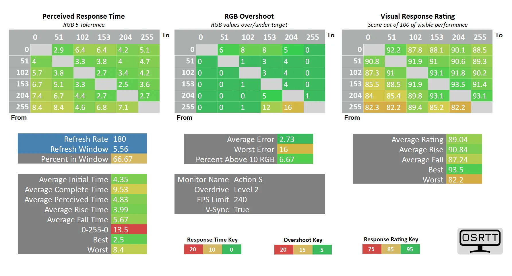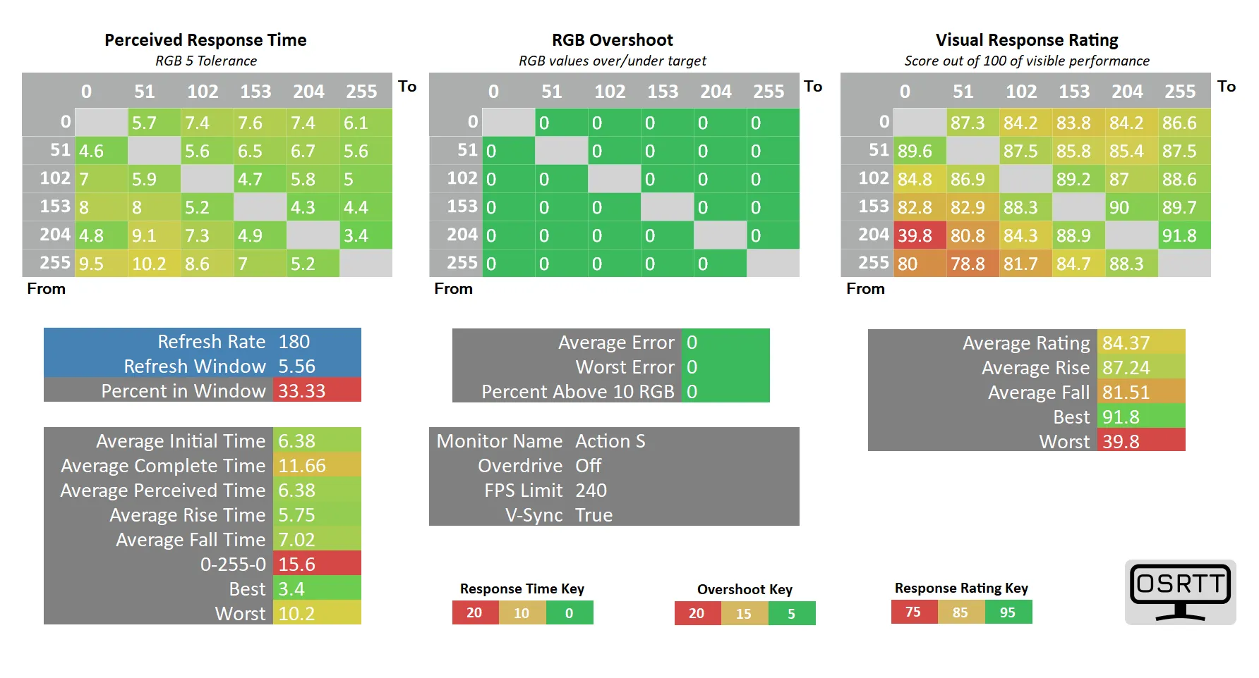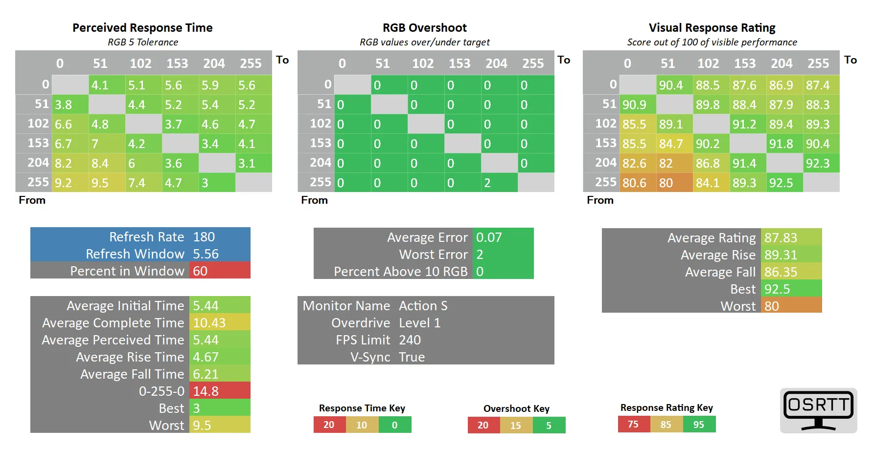 В ходе испытаний на максимальной частоте 180 Гц с помощью аппаратно-программного комплекса OSRTT проблем обнаружено не было. Это обусловлено тем, что Action S не имеет явных пульсаций (как большинство других Mini-LED) и полноценного ШИМ, что положительно сказывается на стабильности результатов и комфорте использования монитора.