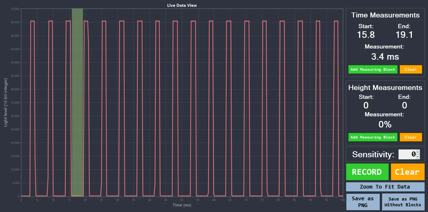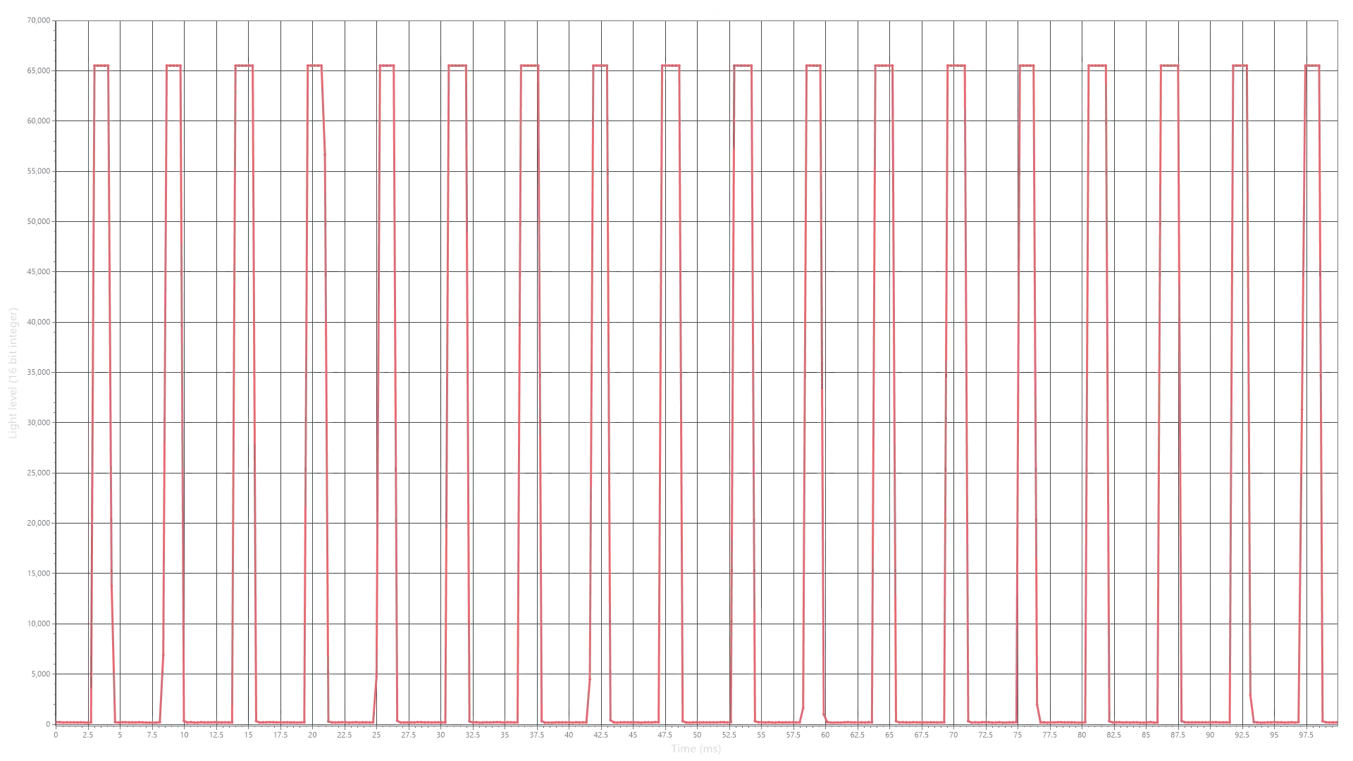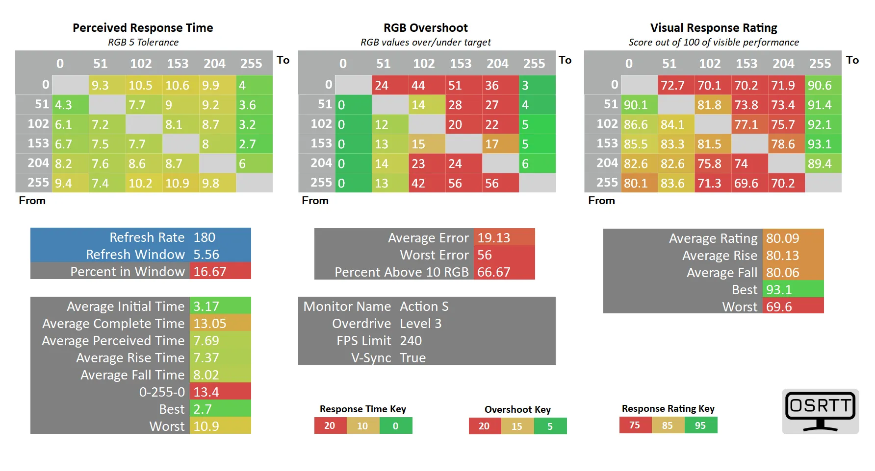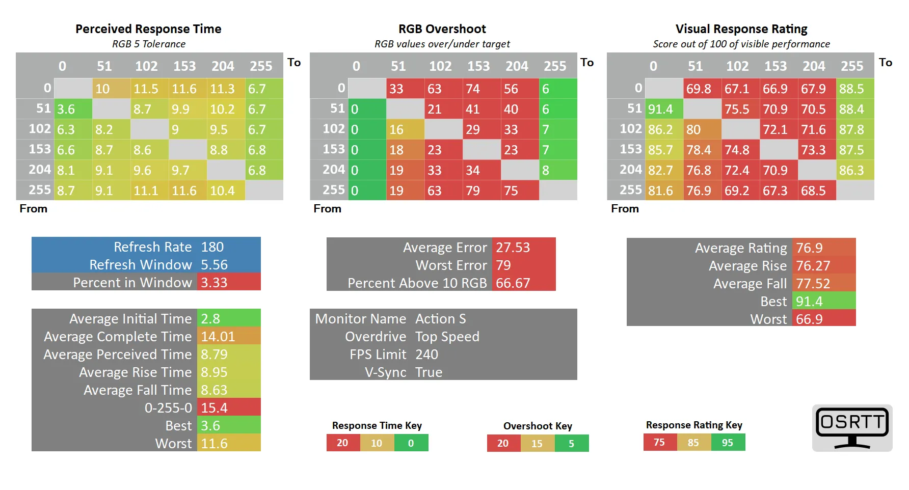 В ходе испытаний на максимальной частоте 180 Гц с помощью аппаратно-программного комплекса OSRTT проблем обнаружено не было. Это обусловлено тем, что Action S не имеет явных пульсаций (как большинство других Mini-LED) и полноценного ШИМ, что положительно сказывается на стабильности результатов и комфорте использования монитора.