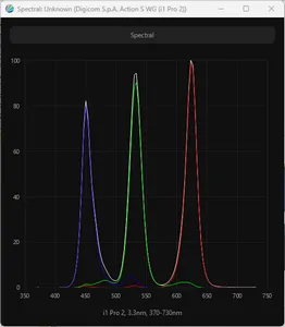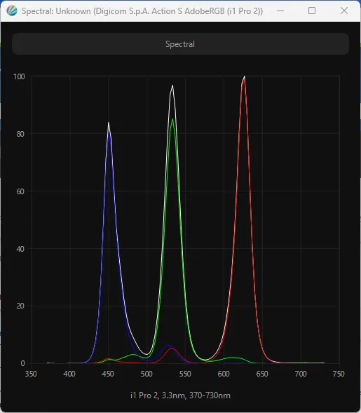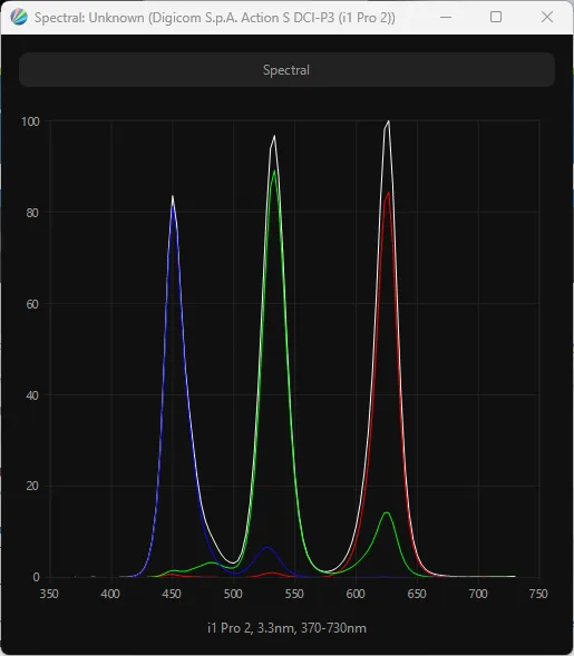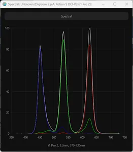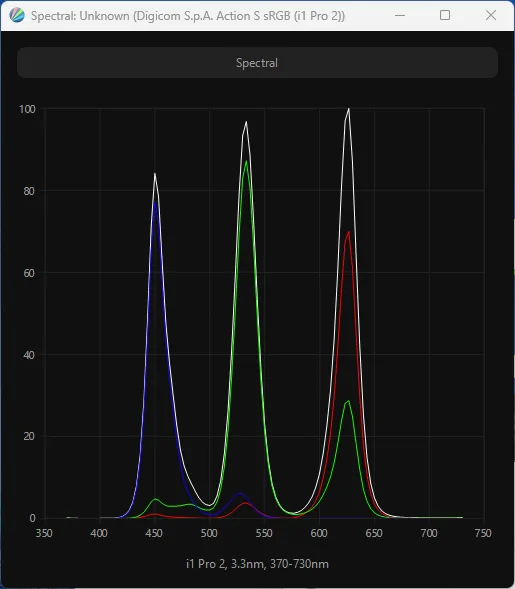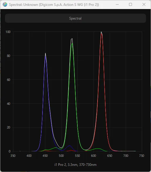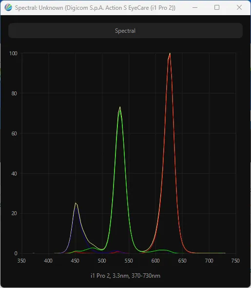 Синий пик в спектре подсветки смещён в относительно безопасную область на 450-451 нм, хотя оптимальным считается диапазон 460-462 нм. Эта технология «аппаратного фильтра синего света» снижает нагрузку на глаза. Дополнительно монитор оснащён технологией Flicker-Free (редко встречается среди продвинутых Mini-LED моделей), устраняющей мерцание экрана, а также программным набором фильтров Low Blue Light для быстрой регулировки цветовой температуры.