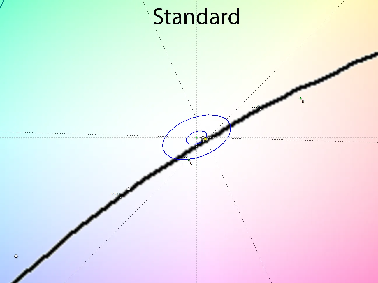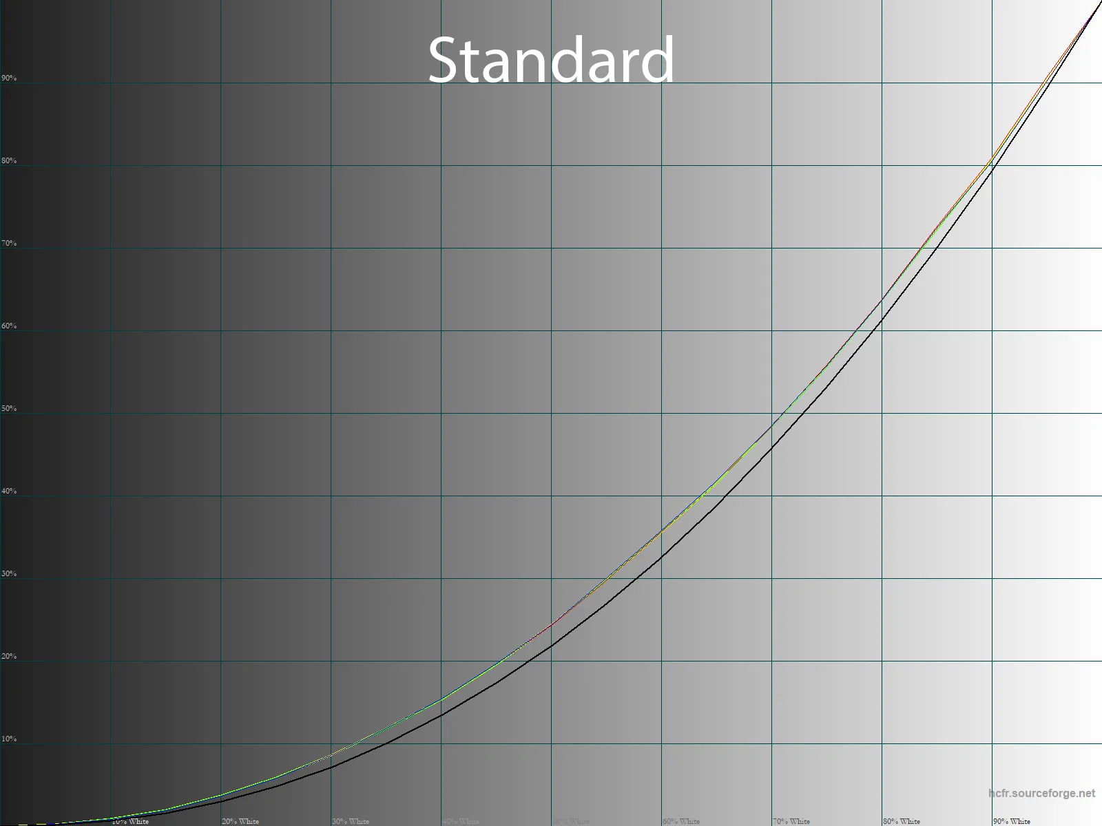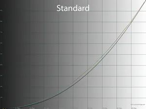 Режим Standard демонстрирует не совсем точно выставленные гамма-кривые: контраст визуально снижен, различимость в тенях достаточная, завалов в светах нет, дисбаланс RGB во всём диапазоне минимальный. Основная масса точек серого клина расположились вблизи зоны DeltaE<3. Различимый паразитный оттенок отсутствует.