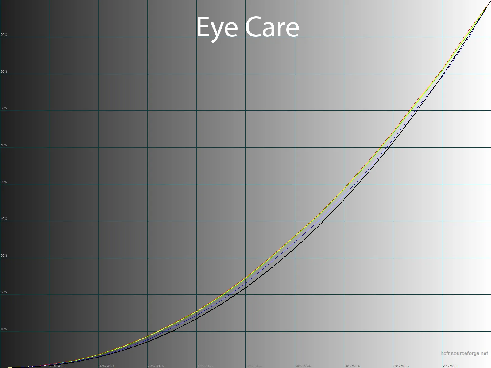 По гамма-кривым можно сделать вывод о сниженном контрасте, есть заметная разбалансировка между каналами, различимость в тенях более чем достаточная. Яркость по умолчанию выставлена на адекватном уровне, а поэтому если вы хотите без лишних действий (за пару кликов) добиться снижения нагрузки на ваш зрительный аппарат, то Eye Care вполне себе годится, хотя и не предлагает каких-либо инноваций и не полностью соответствует максимально грамотному подходу (контраст можно было бы снизить ещё сильнее, точку белого поднять до 0.5-0.7 нит).